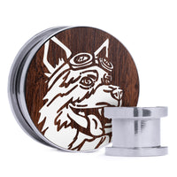 Limited Edition, High Quality Silver Steel Double flare Screw Back Walnut & White Inlay Plugs featuring the laser engraved "Dogmeat"