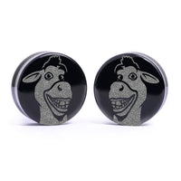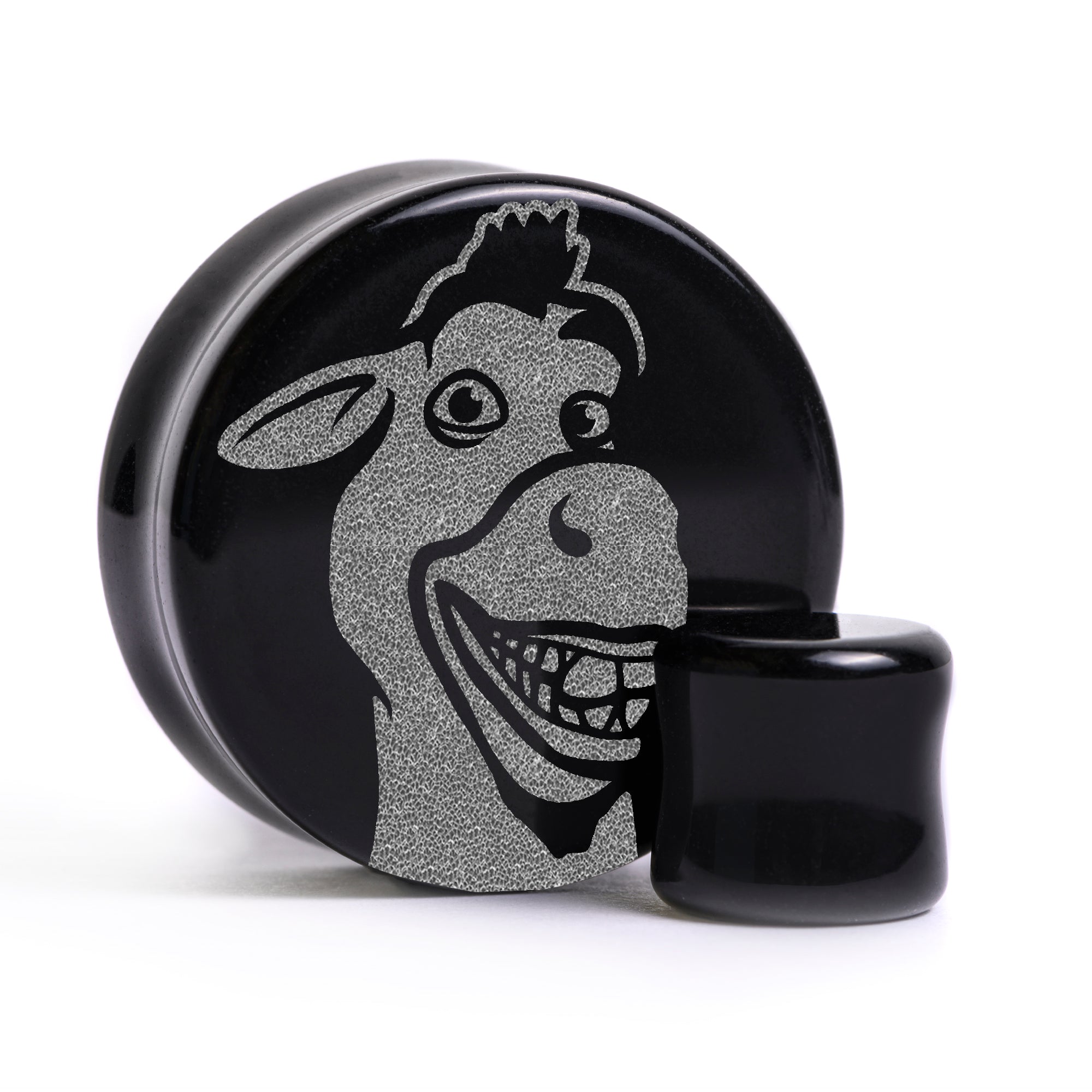 Flat Faced Doubleflared Black Glass Plugs featuring laser engraved “Donkey - Shrek'' design.