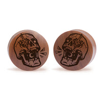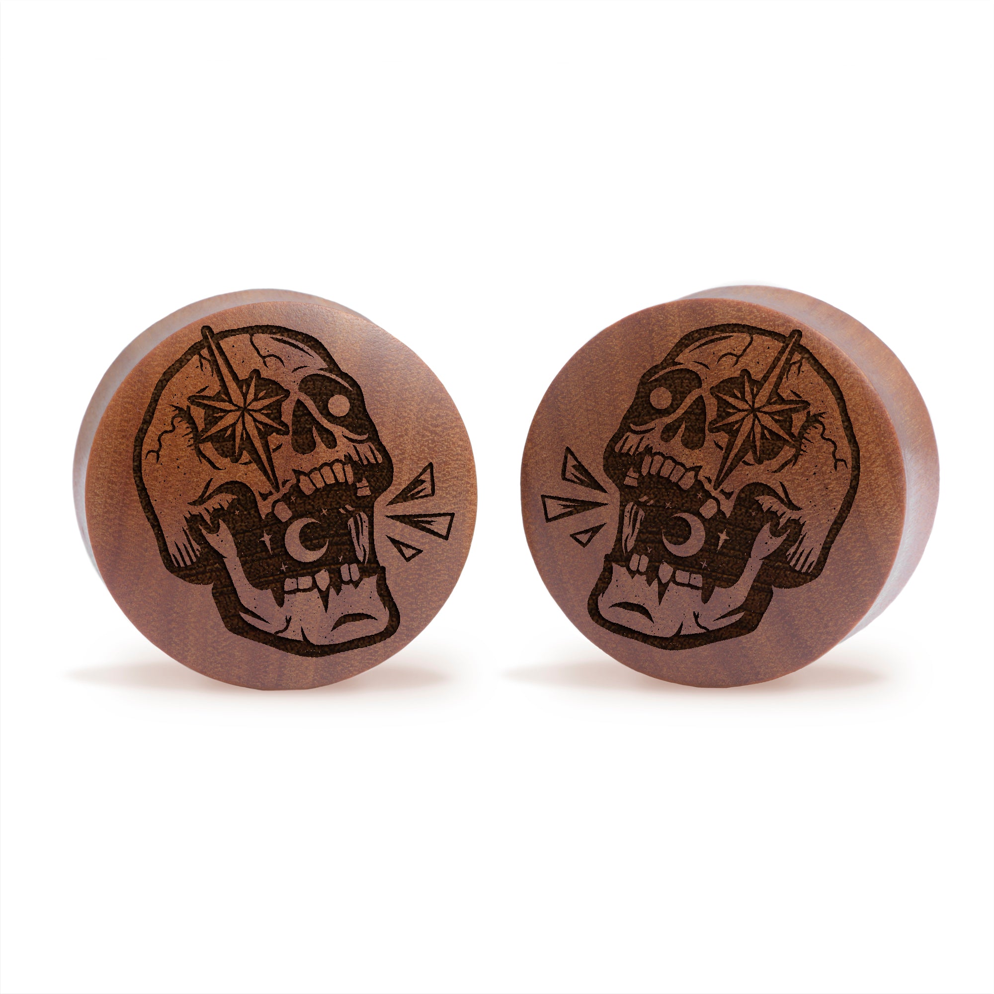 Limited Edition Convex Doubleflared Saba Wood Plugs featuring our laser engraved “Enlightened Skull" design. This product is part of our Halloween Promotion.