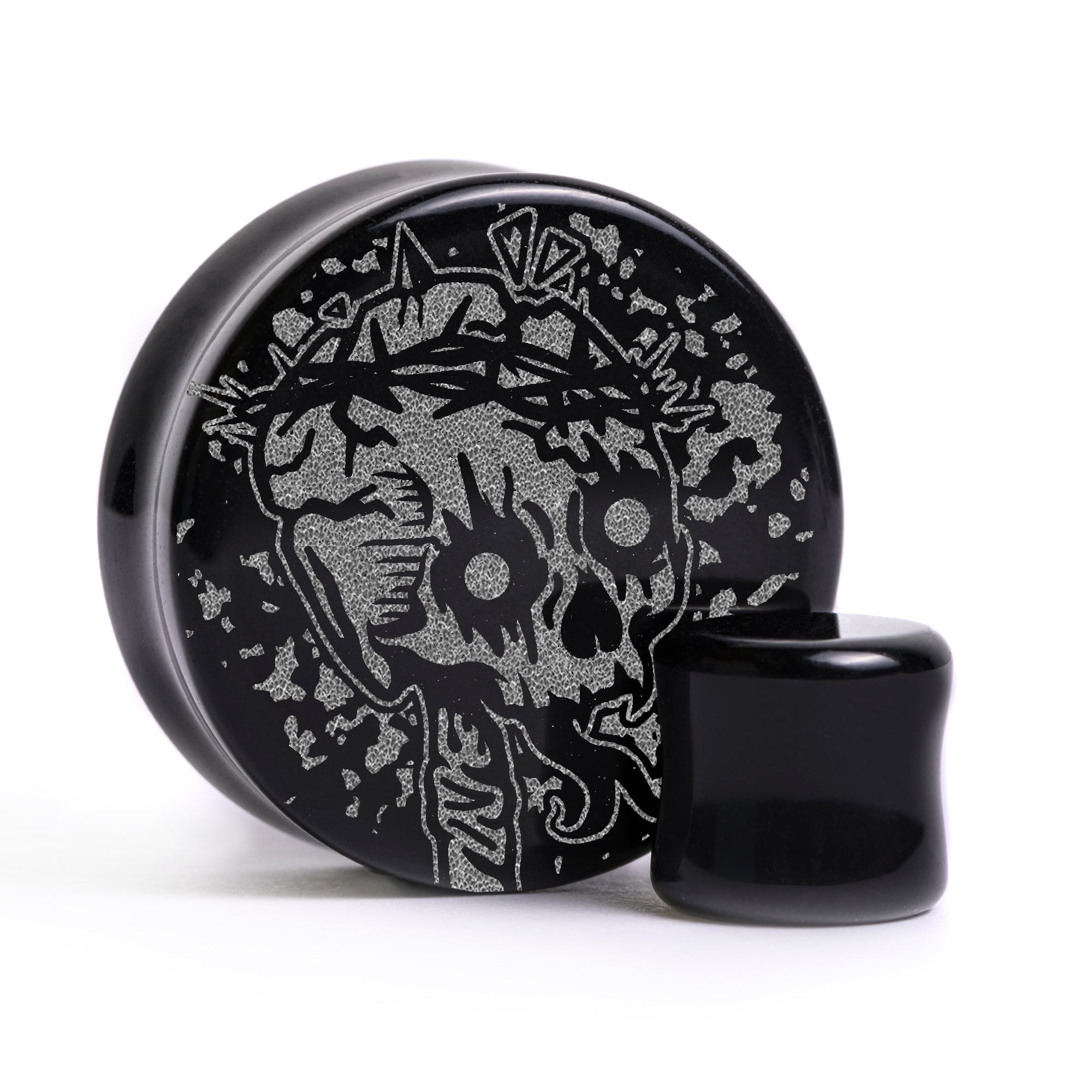 Limited Edition Flat Faced Doubleflared Black Glass Plugs featuring our laser engraved “Fallen King" design. This product is part of our Halloween Promotion