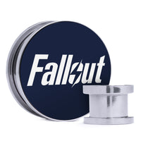 Limited Edition, High Quality Silver Steel Double flare Screw Back Blue & White Inlay Plugs featuring the laser engraved "Fallout Logo"