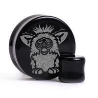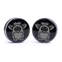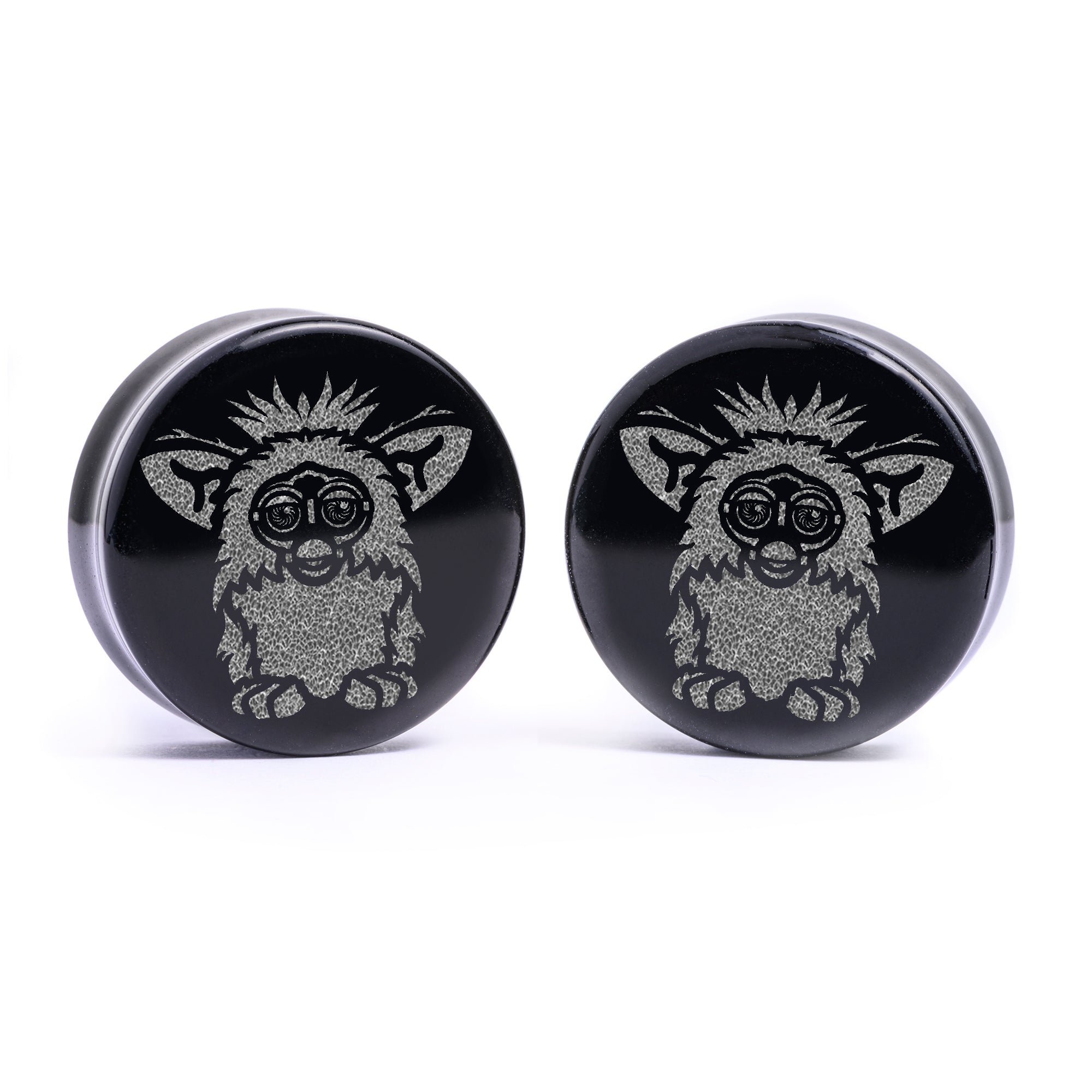 Flat Faced Doubleflared Black Glass Plugs featuring laser engraved “Furby'' design.