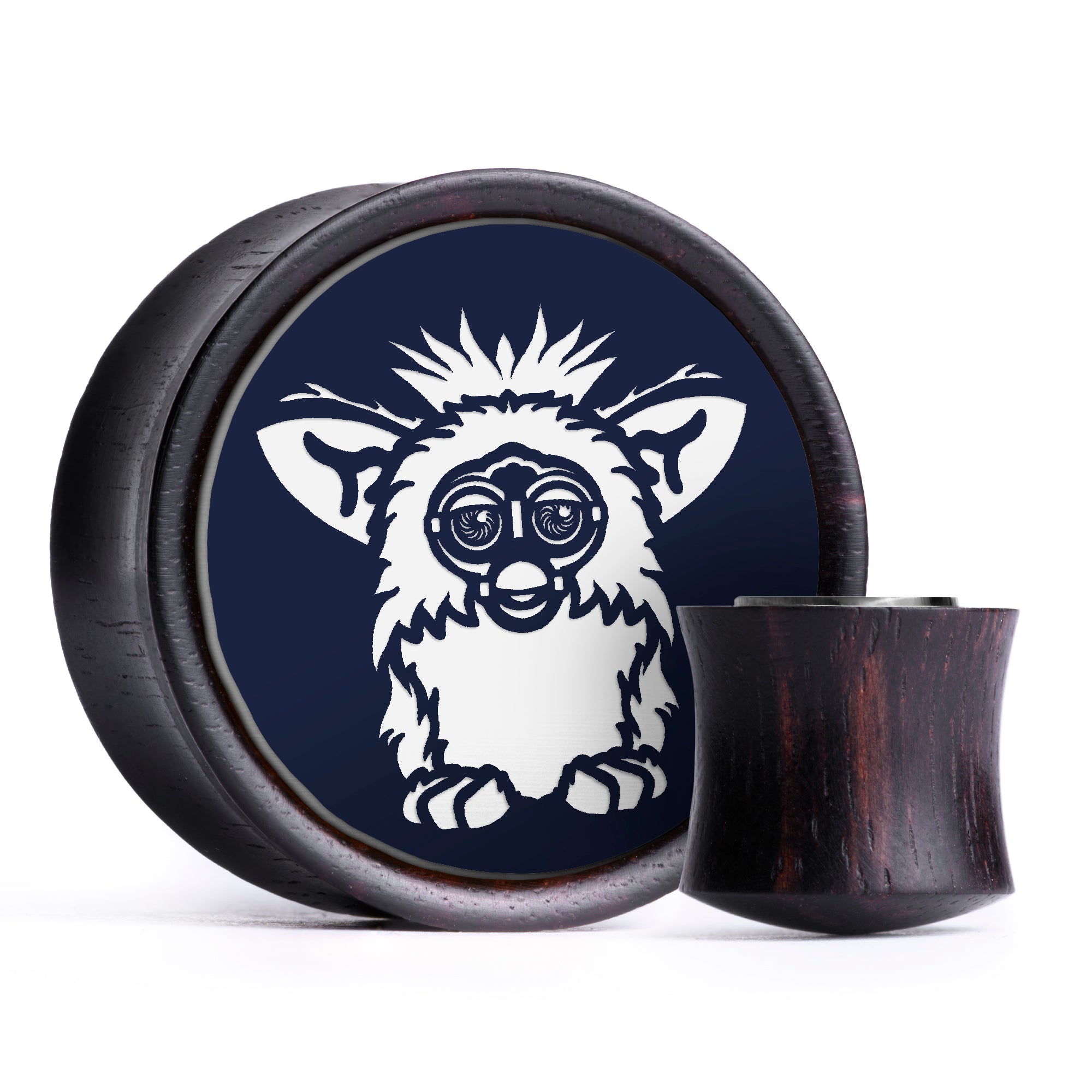 Limited Edition Double flared Ebony Blue & White Inlay Wood Plugs featuring the laser engraved "Furby"