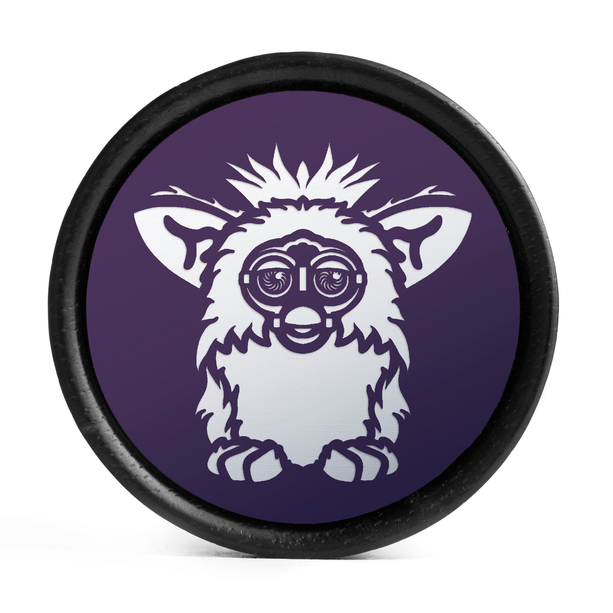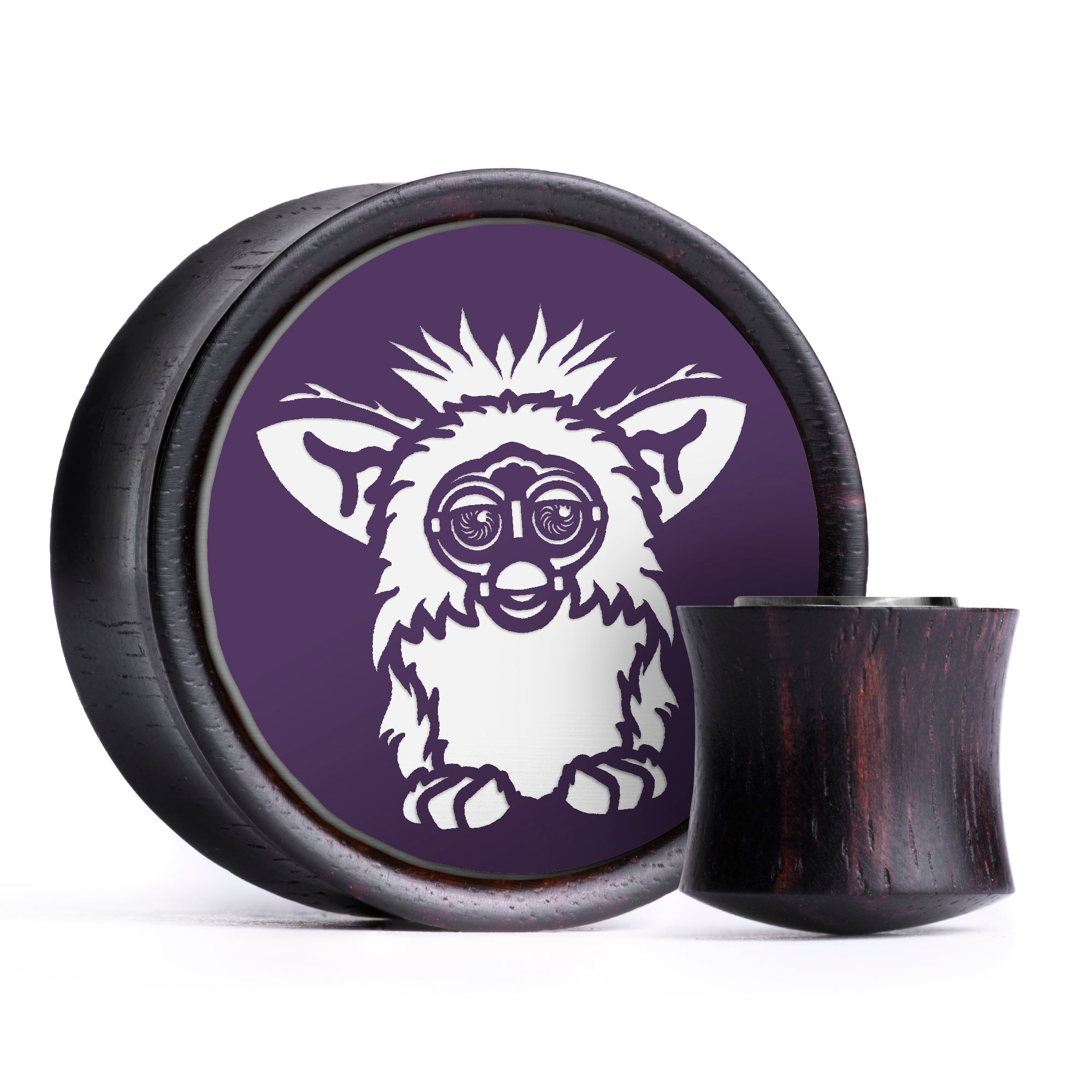 Limited Edition Double flared Ebony Purple & White Inlay Wood Plugs featuring the laser engraved "Furby"