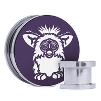 Limited Edition, High Quality Silver Steel Double flare Screw Back Purple & White Inlay Plugs featuring the laser engraved "Furby"