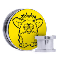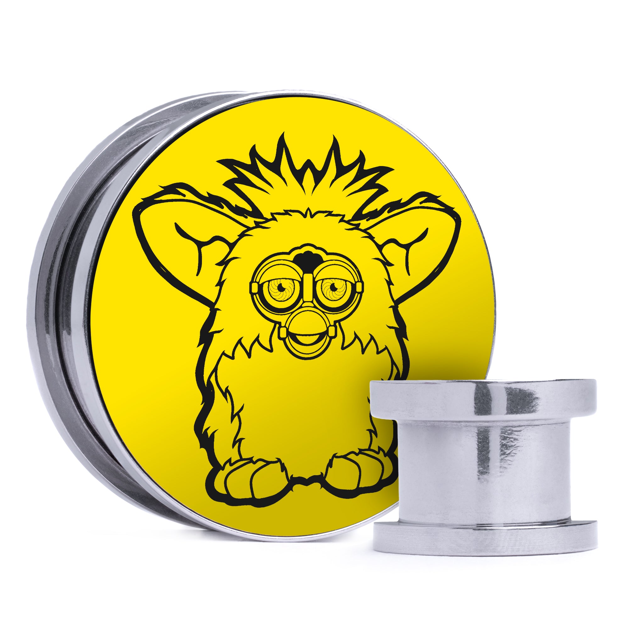Limited Edition, High Quality Silver Steel Double flare Screw Back Yellow & Black Inlay Plugs featuring the laser engraved "Furby"