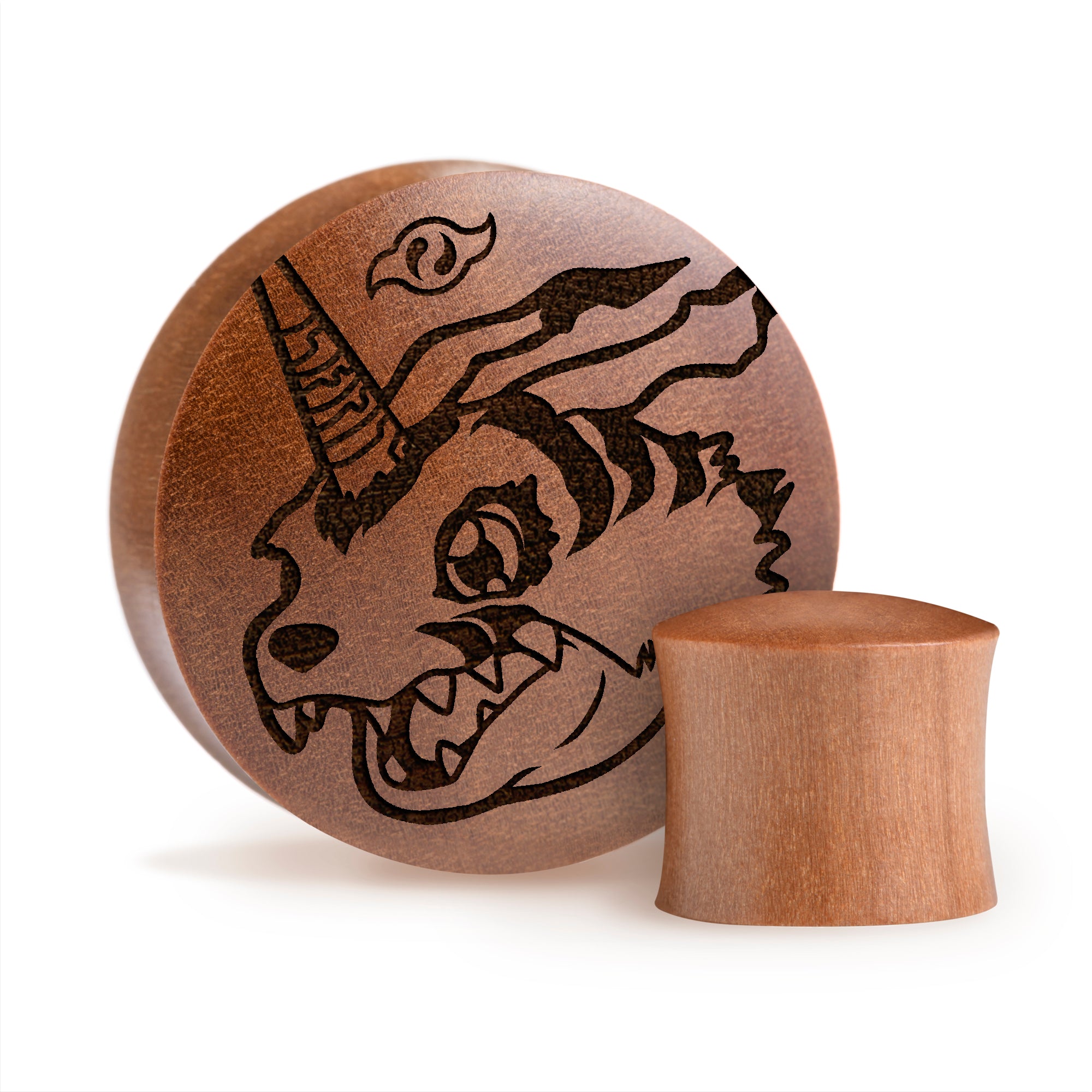 Convex Doubleflared Saba Wood Plugs featuring our laser engraved “Gabumon - Digimon" design.