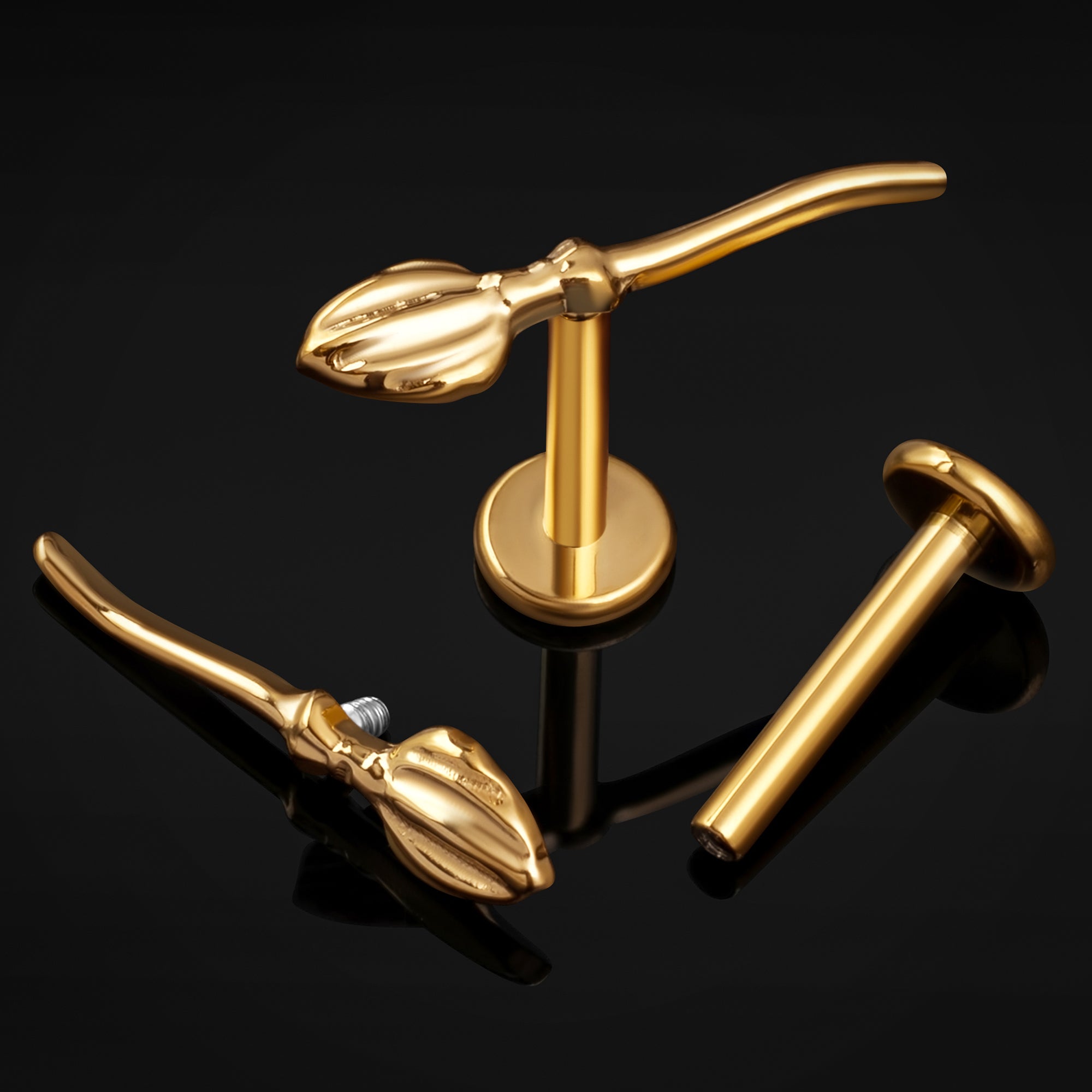 Embrace the eerie spirit of Halloween with this Gold Broomstick Internally Threaded Titanium Labret Stud. Its gleaming Gold finish and delicate Broomstick design bring a subtle yet spooky charm to your jewellery collection. Crafted with a 1.2mm gauge and an internally threaded design ensuring a secure, comfortable fit, this labret stud is the perfect haunting accessory to cast a shadow of style and mischief wherever you go.
