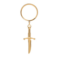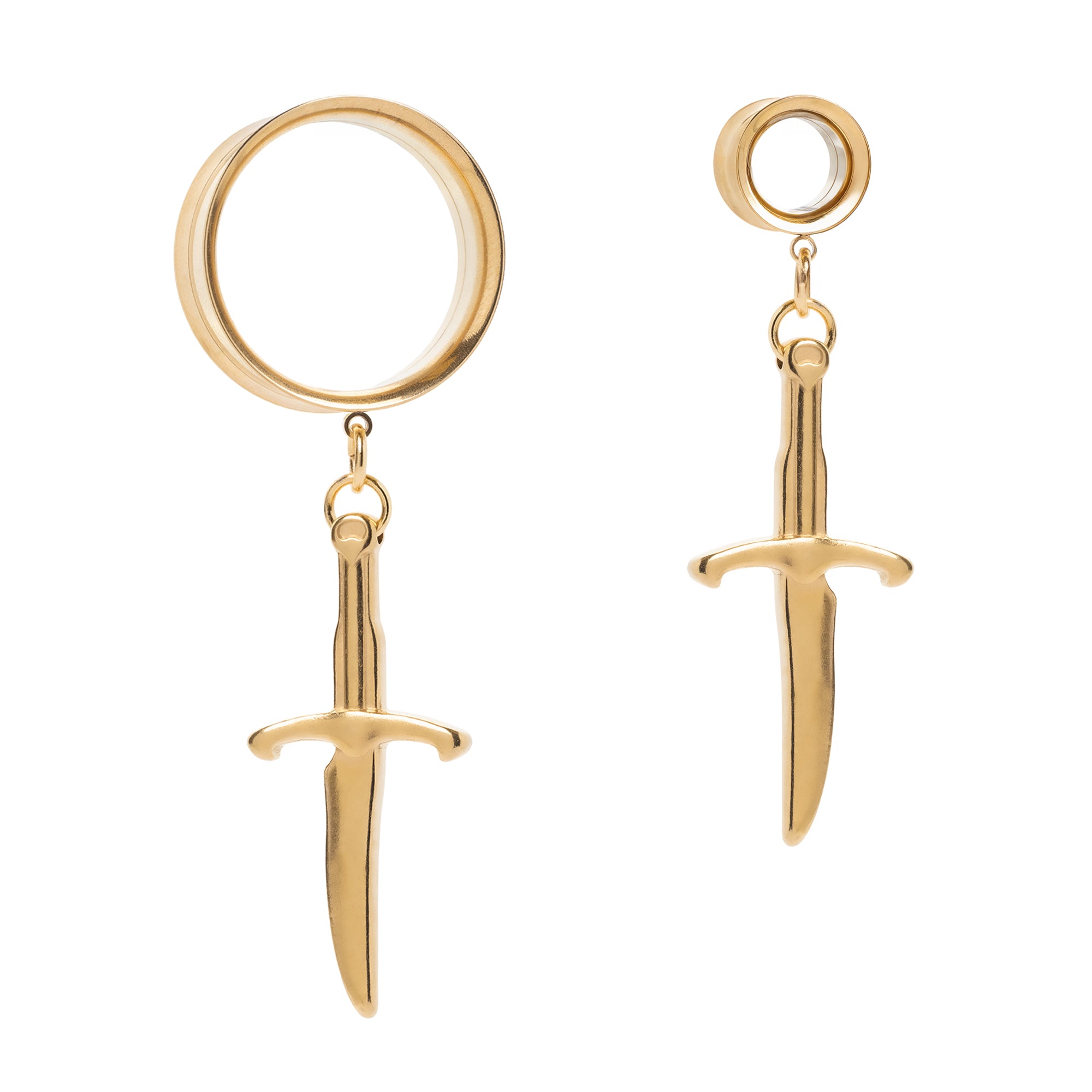 High Quality The Gold Dagger Charm Gold Steel Double Flared Tunnel Dangle. Double flare steel Tunnel with Screwback.