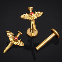 Embrace the eerie spirit of Halloween with this Gold Jewelled Bat Wing Sword Labret Stud. Its gleaming Gold finish and red stone bring a subtle yet spooky charm to your jewellery collection. Crafted with a 1.2mm gauge and an internally threaded design ensuring a secure, comfortable fit, this labret stud is the perfect haunting accessory to cast a shadow of style and mischief wherever you go.