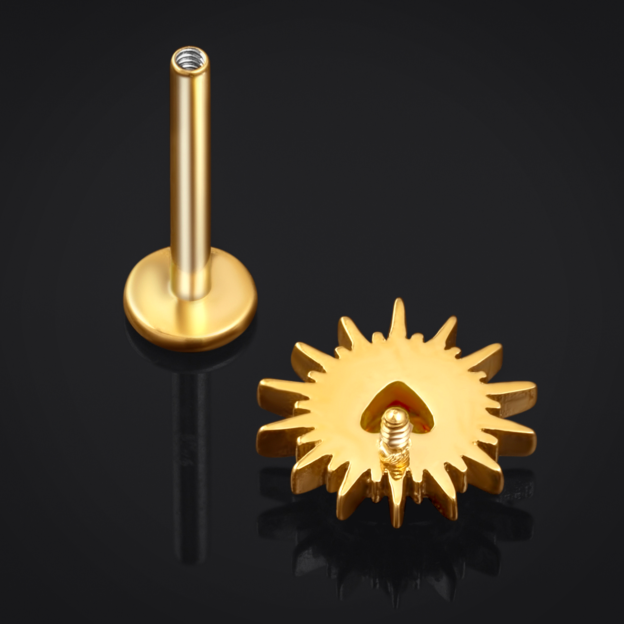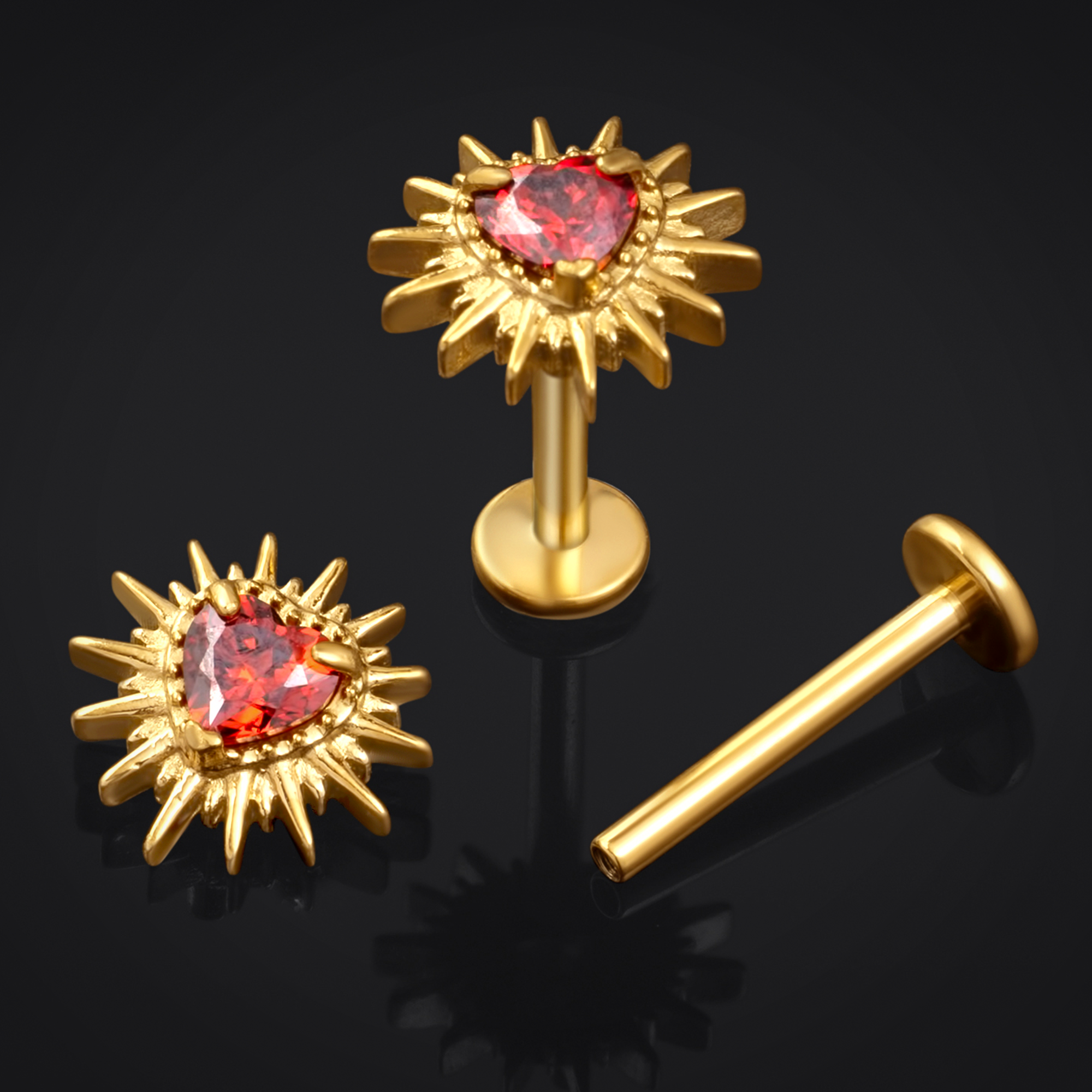 This Gold Spiked Heart Red Jewelled Labret Stud features a 1.2mm gauge and is crafted from high-quality titanium, ensuring biocompatibility and durability. The internally threaded design minimizes tissue damage during insertion and removal, promoting healing and comfort. Perfect for adding a touch of elegance while supporting your skin’s comfort.