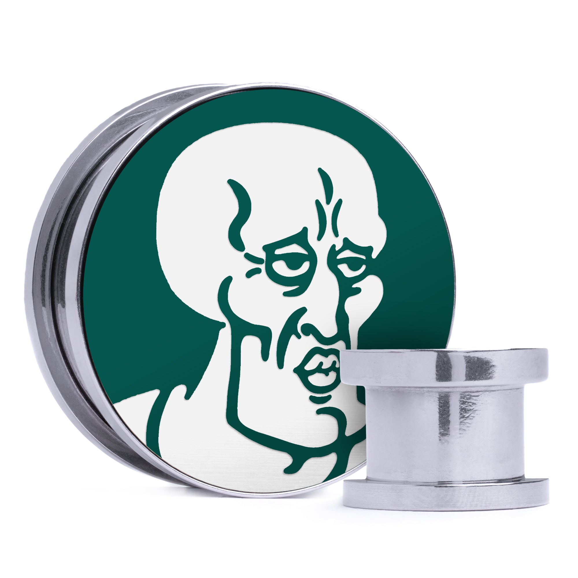 Limited Edition, High Quality Silver Steel Double flare Screw Back Evergreen & White Inlay Plugs featuring the laser engraved "Handsome Squidward"