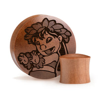 Convex Double flared Saba Wood Plugs featuring our laser engraved "Hula Lilo" design.