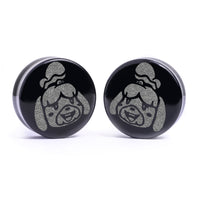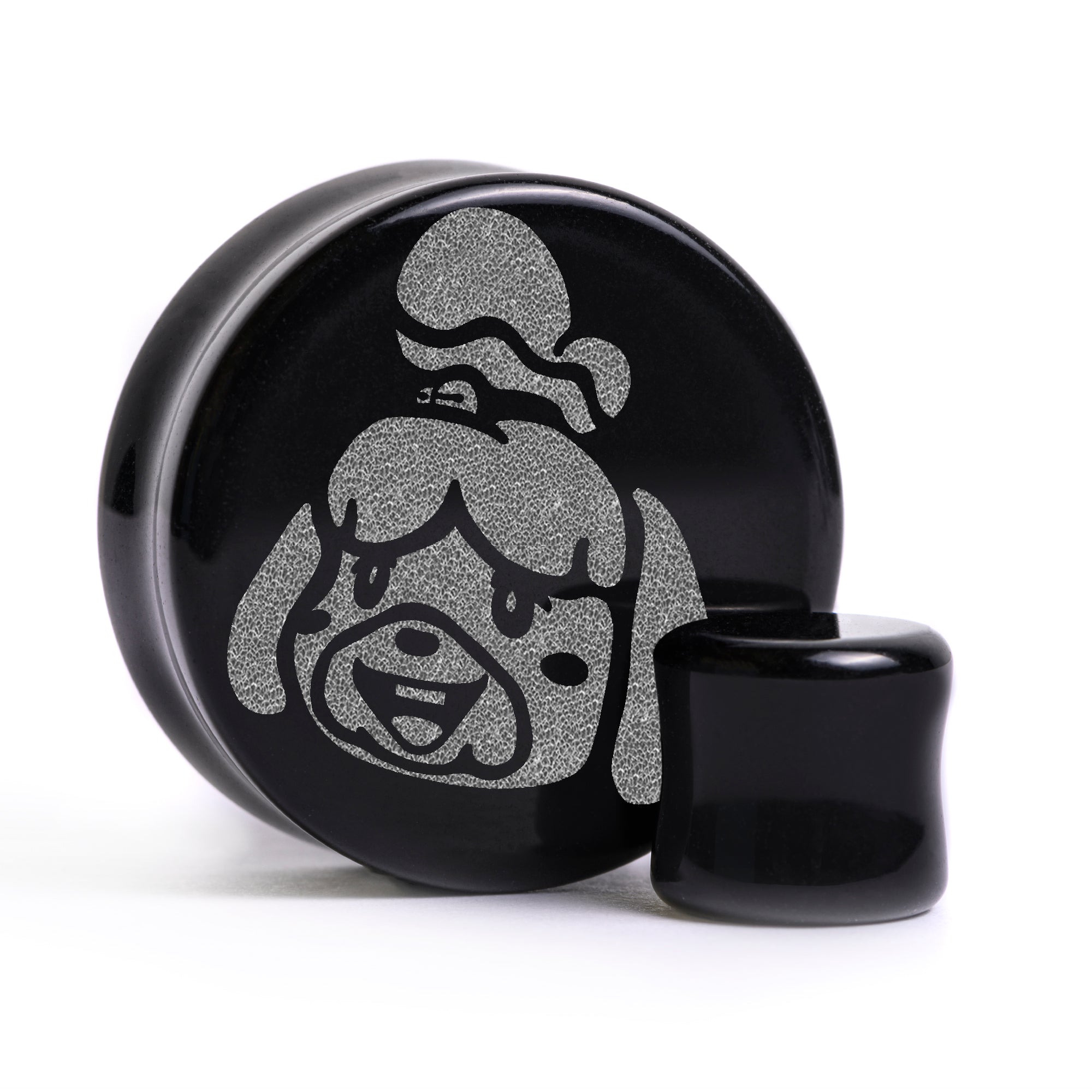 Flat Faced Doubleflared Black Glass Plugs featuring laser engraved “Isabelle Animal Crossing"  plugs have a flat front and flat back.‚ Glass plugs are known for being smooth, durable and easy to insert.‚ Glass is an inert material which makes them great for people with sensitive ears as they are very unlikely to cause reactions.