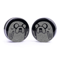 Flat Faced Doubleflared Black Glass Plugs featuring laser engraved “Jake The Dog'' design.