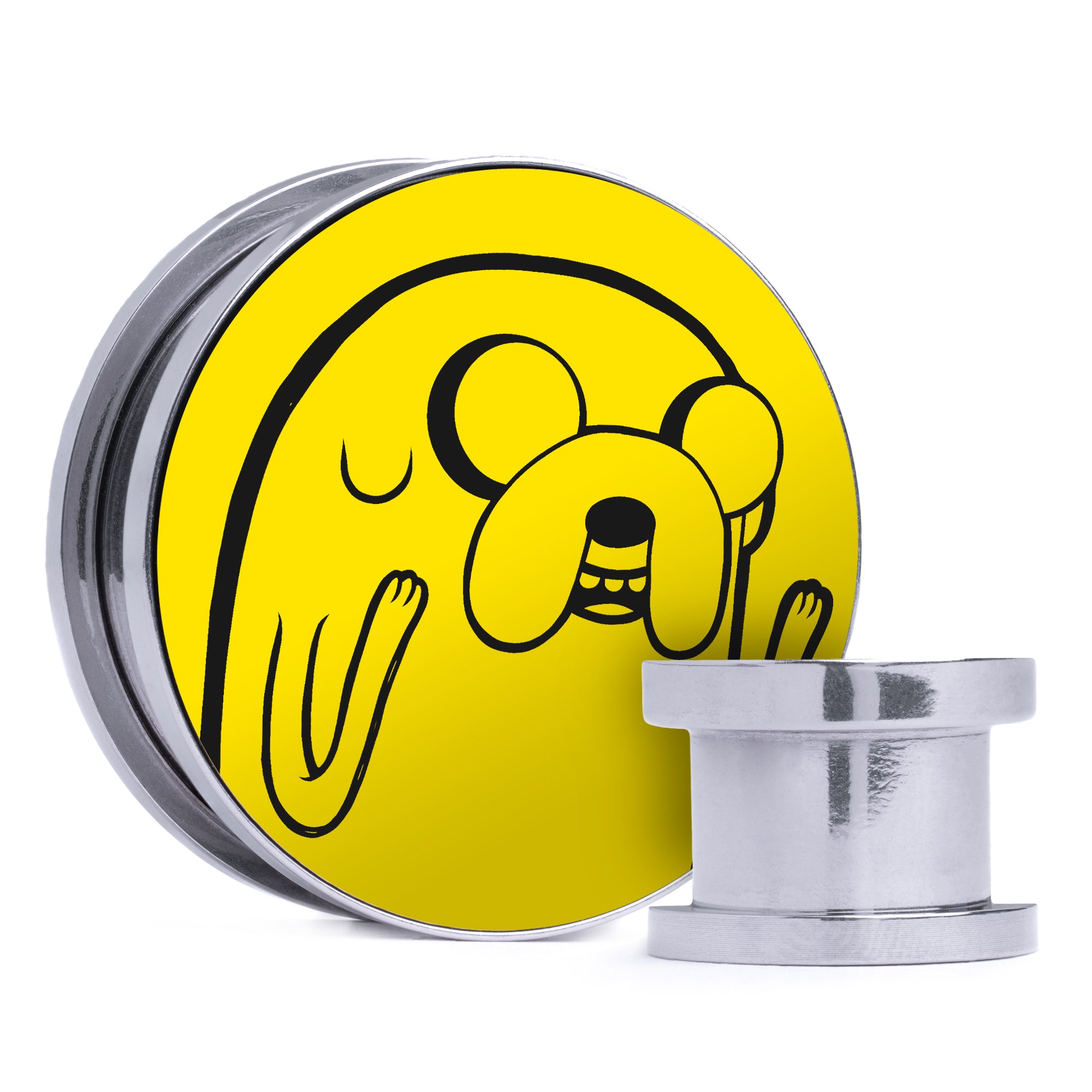 Limited Edition, High Quality Silver Steel Double flare Screw Back Yellow & Black Inlay Plugs featuring the laser engraved "Jake The Dog"