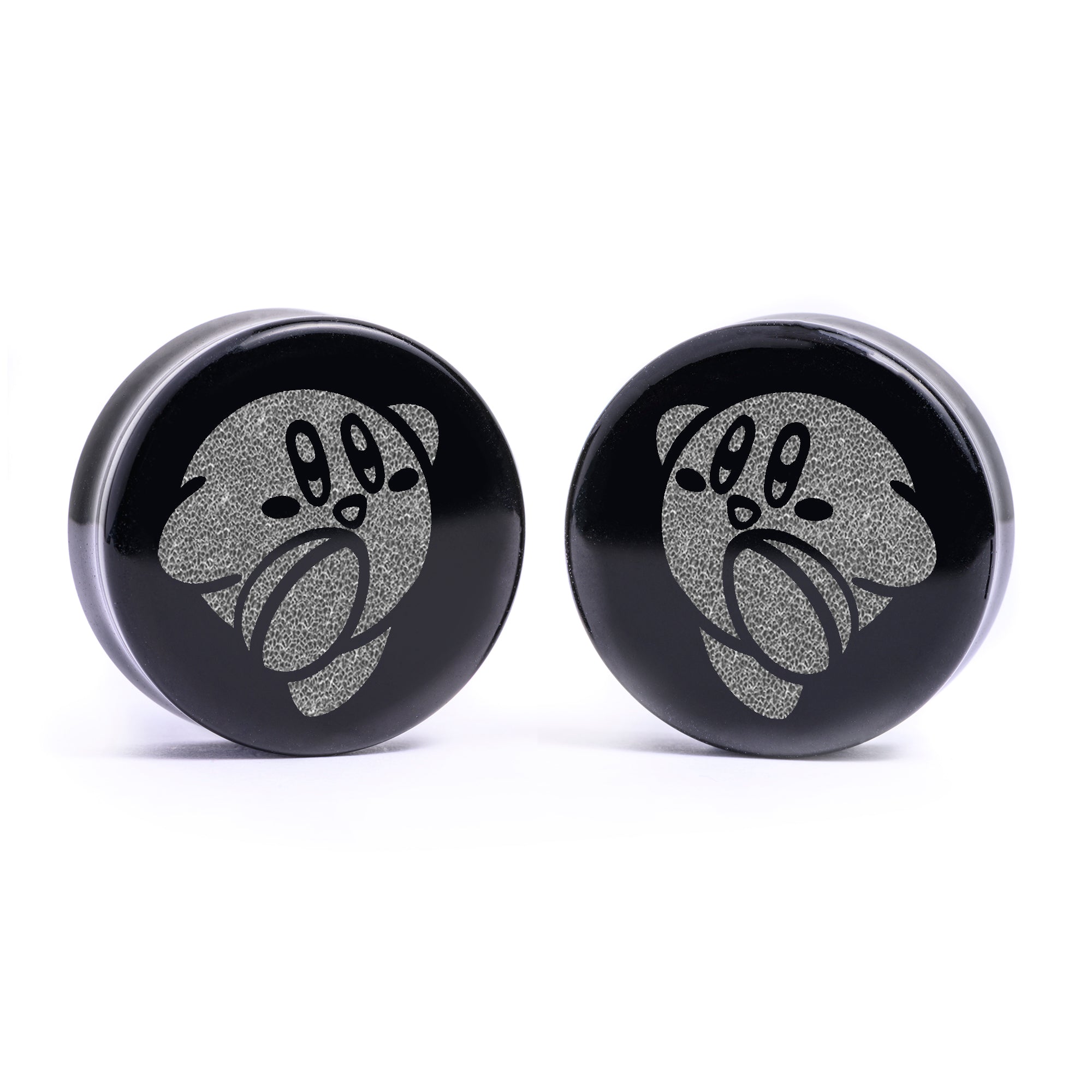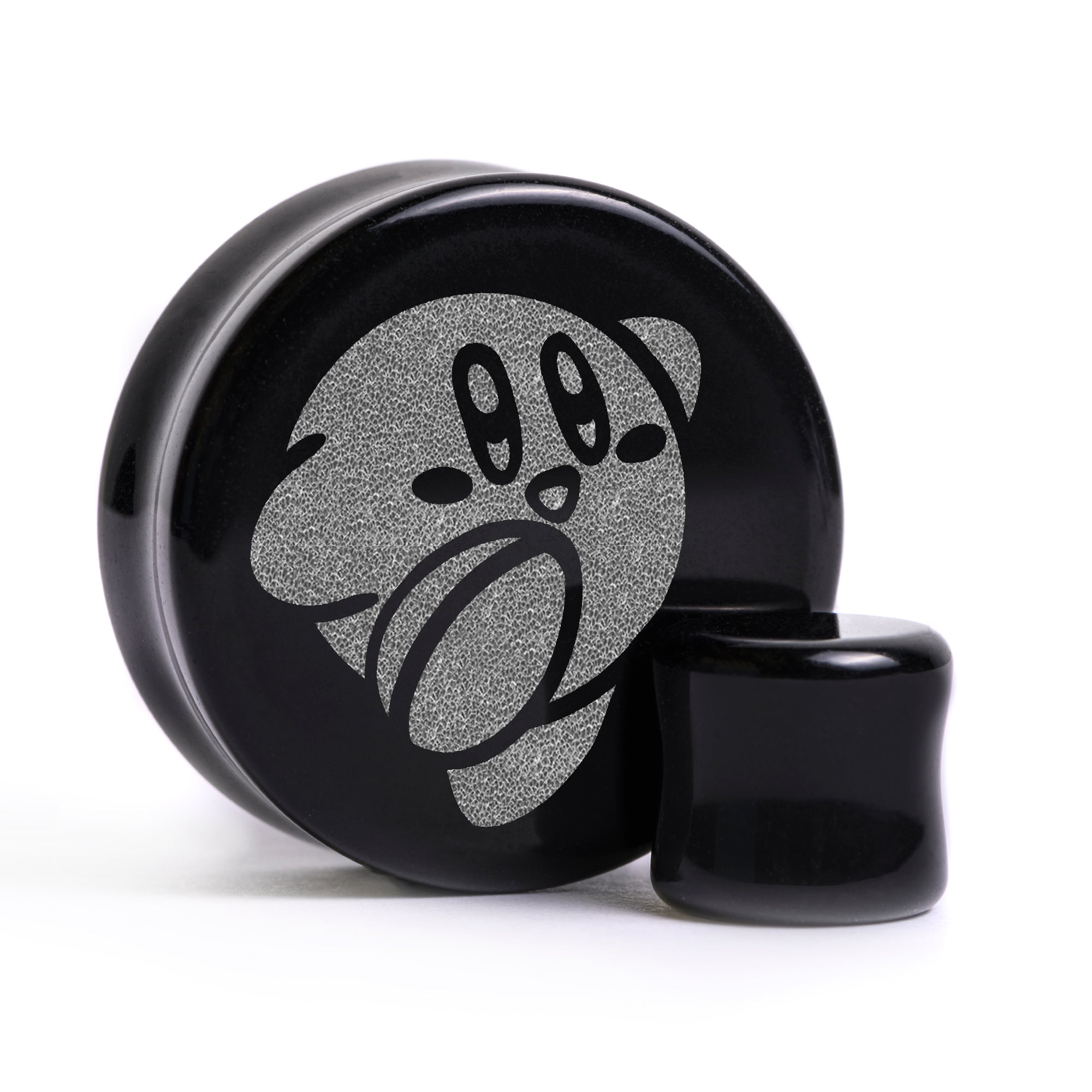 Flat Faced Doubleflared Black Glass Plugs featuring laser engraved “Kirby"  plugs have a flat front and flat back.‚ Glass plugs are known for being smooth, durable and easy to insert.‚ Glass is an inert material which makes them great for people with sensitive ears as they are very unlikely to cause reactions.