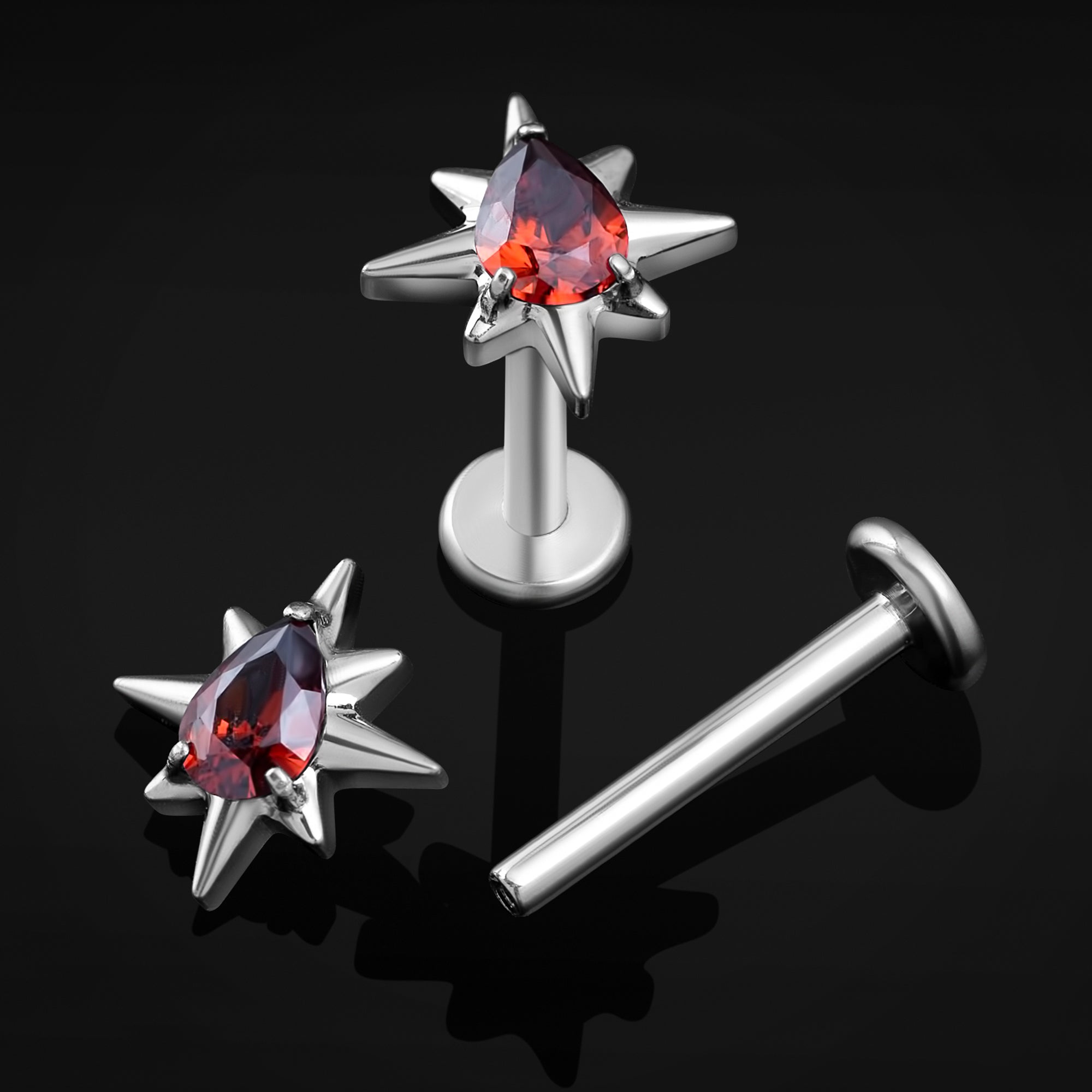 Silver 8 Point Star Red Teardrop Jewel Labret Stud- 6mm / 8mm / 10mm Internally Threaded / Body Jewellery / Lip / Nose / Ear Labret