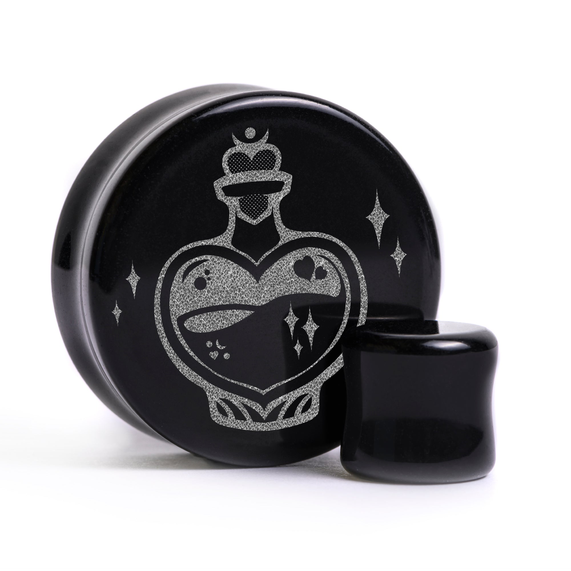 Limited Edition Flat Faced Doubleflared Black Glass Plugs featuring our laser engraved “Love Potion" design. This product is part of our Halloween Promotion