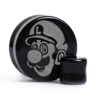 Flat Faced Doubleflared Black Glass Plugs featuring laser engraved "Luigi" design.