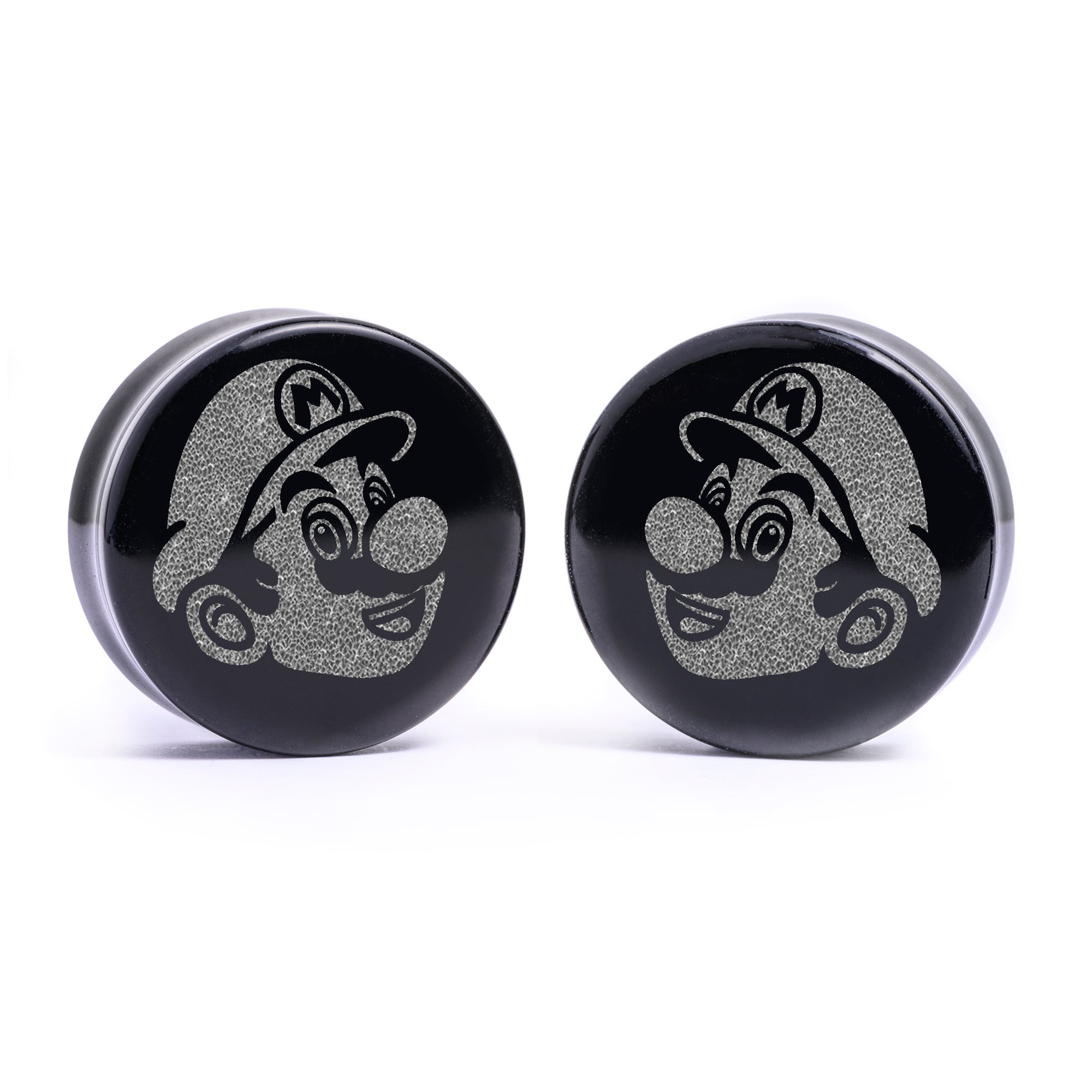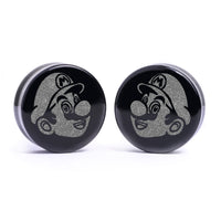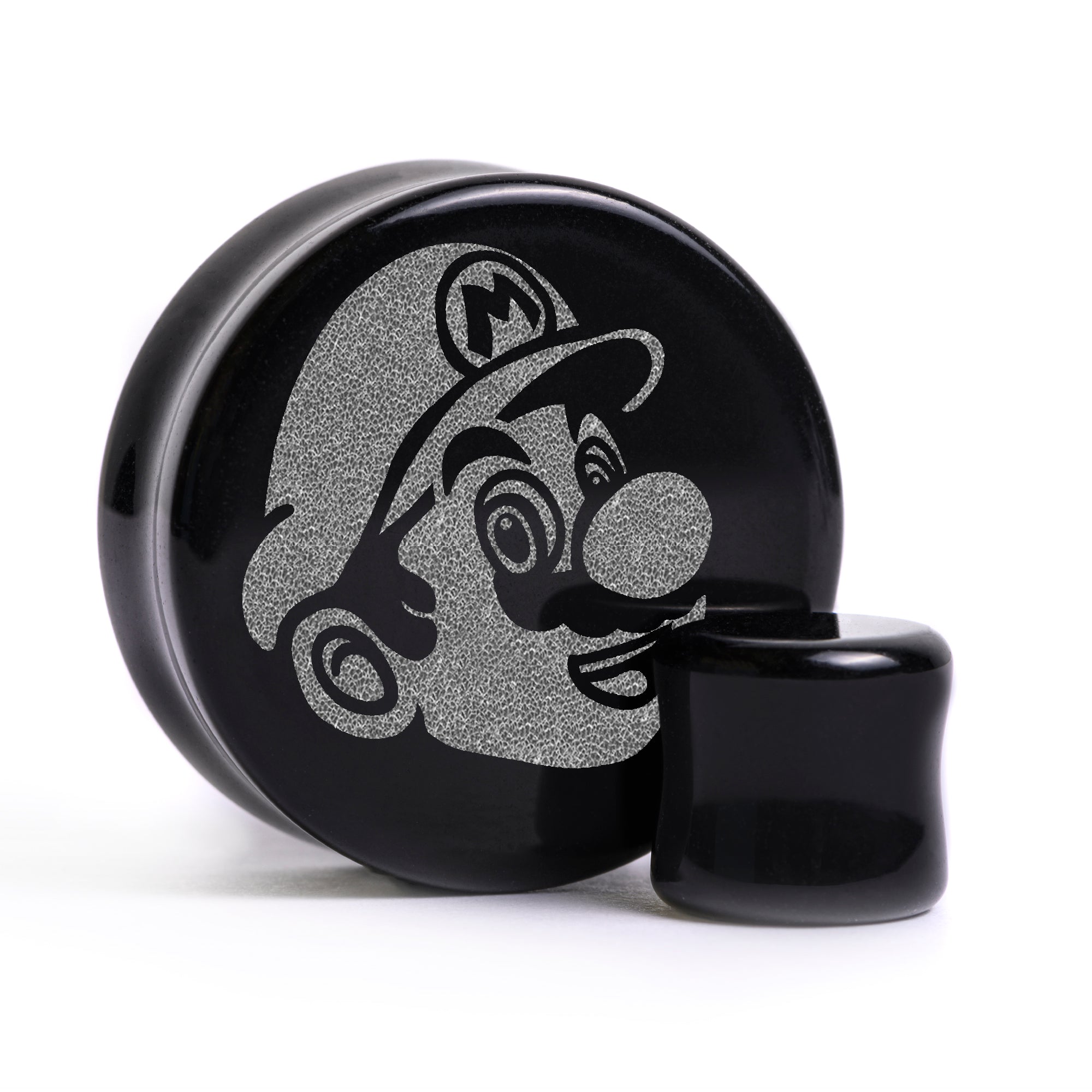 Flat Faced Doubleflared Black Glass Plugs featuring laser engraved “Mario"  plugs have a flat front and flat back.‚ Glass plugs are known for being smooth, durable and easy to insert.‚ Glass is an inert material which makes them great for people with sensitive ears as they are very unlikely to cause reactions.