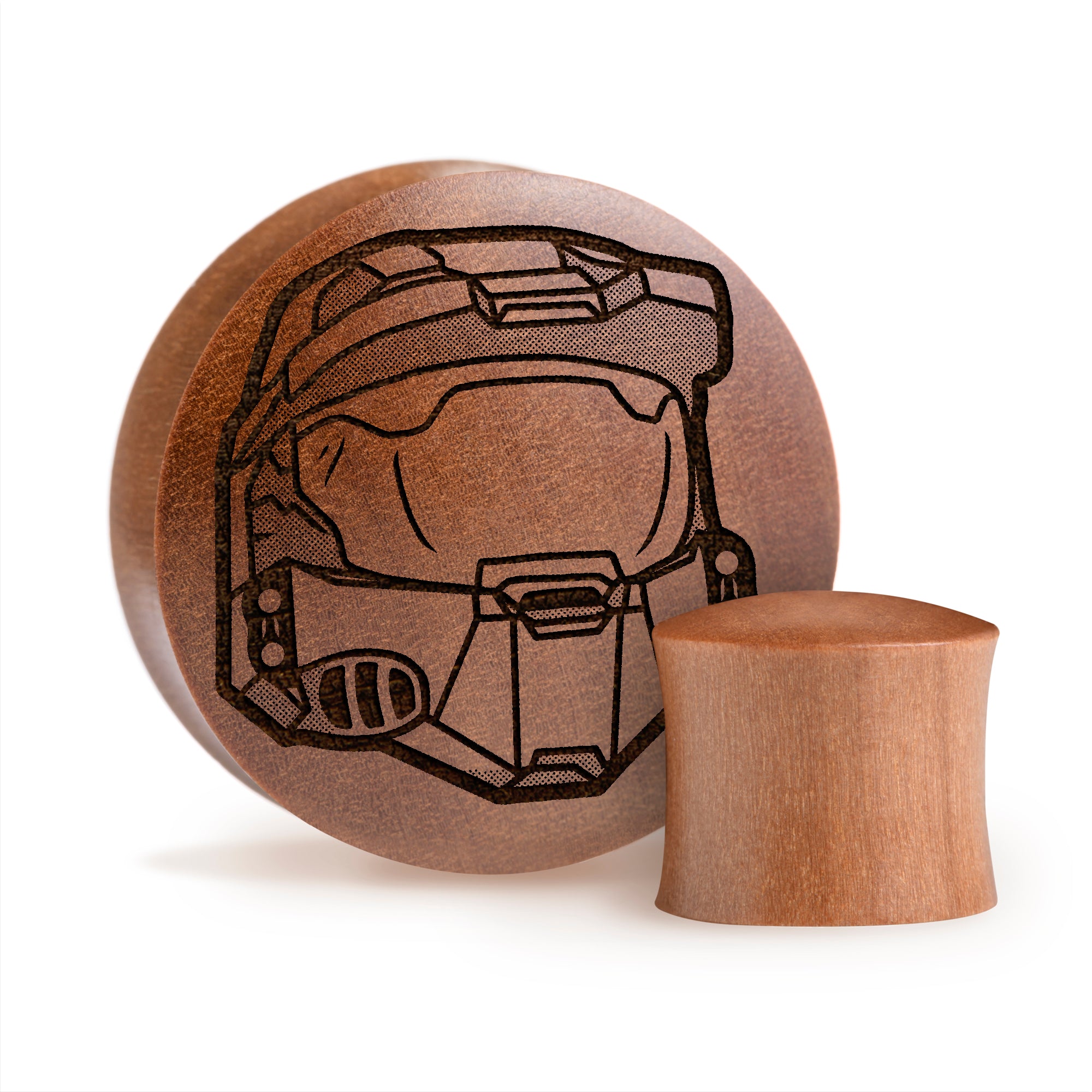 Convex Double flared Saba Wood Plugs featuring our laser engraved “Master Chief" design.