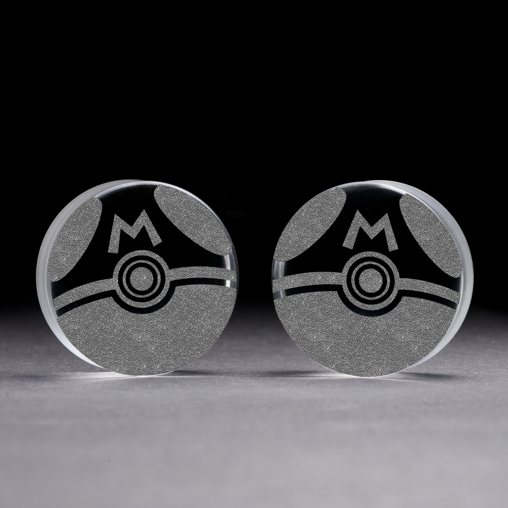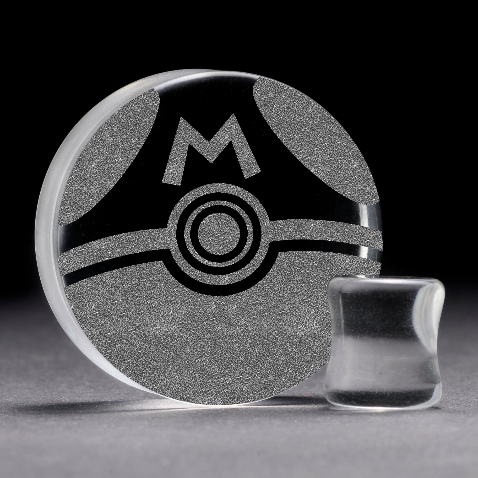 Flat‚ Faced‚ Doubleflared‚ Clear‚ Glass Plugs featuring our laser engraved “MASTERBALL" design.