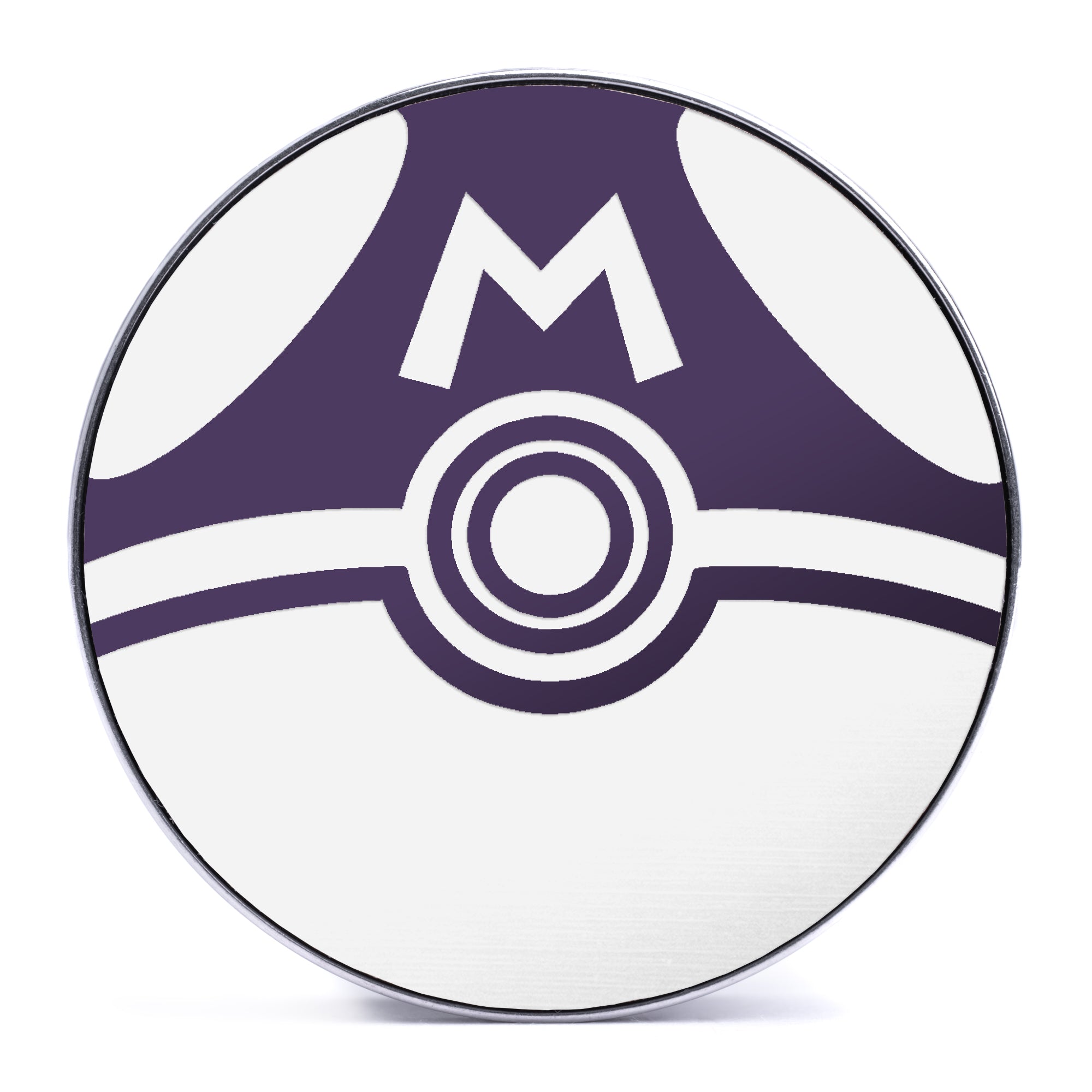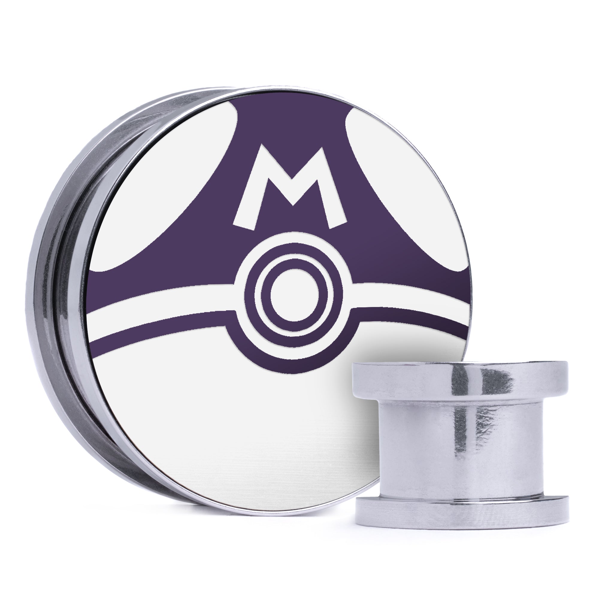 Limited Edition, High Quality Silver Steel Double flare Screw Back Purple & White Inlay Plugs featuring the laser engraved "Master Ball"from Pokémon