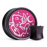 Limited Edition Double flared Ebony Pink & White Inlay Wood Plugs featuring the laser engraved Pokemon "Mew"