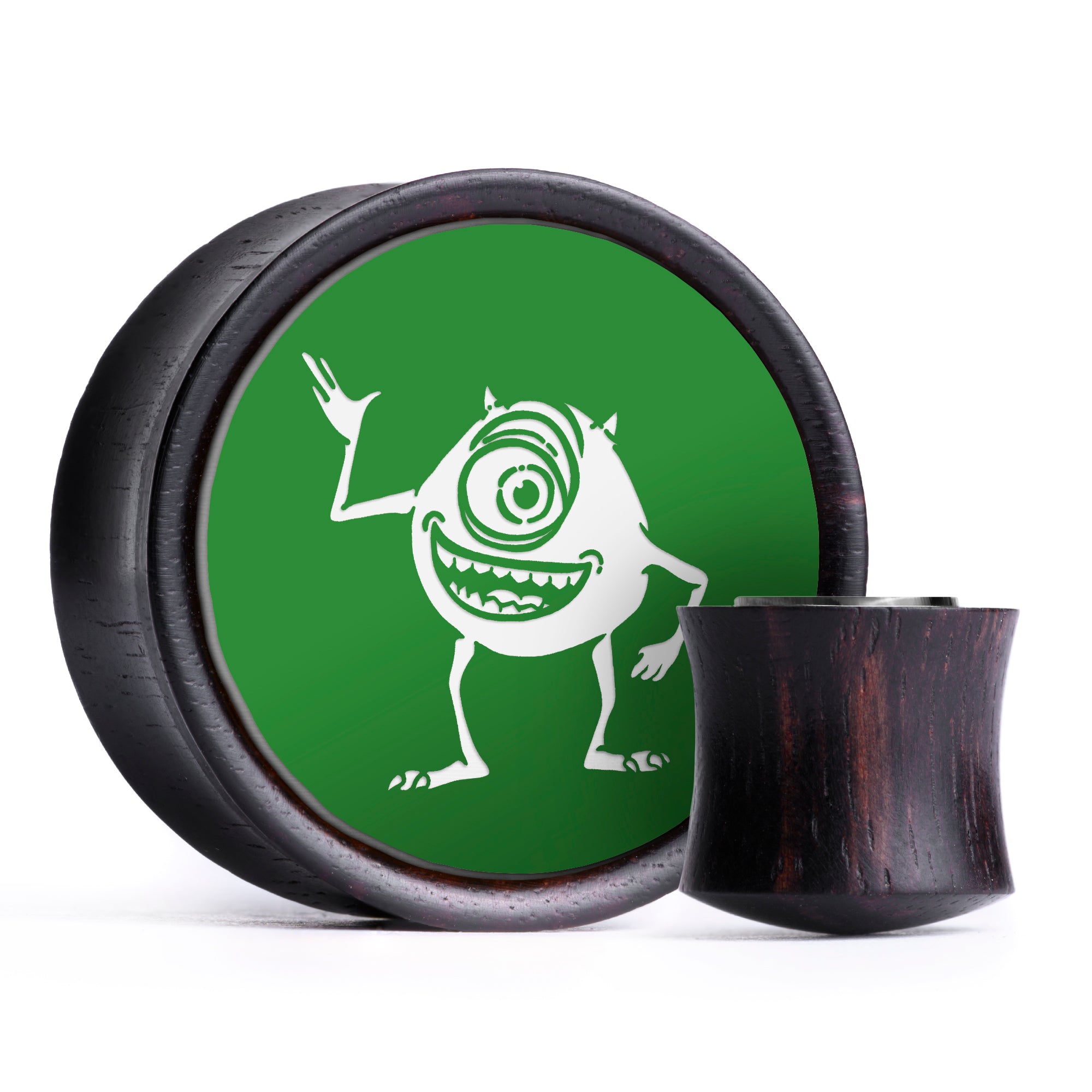 Limited Edition Double flared Ebony Green & White Inlay Wood Plugs featuring the laser engraved "Mike Wazowski"