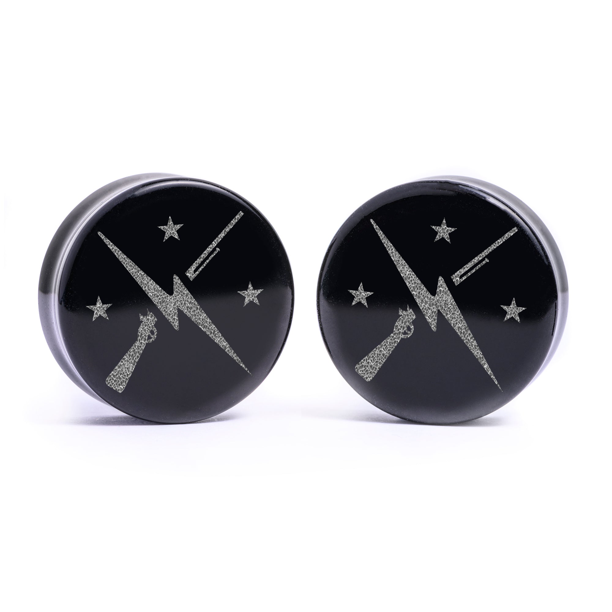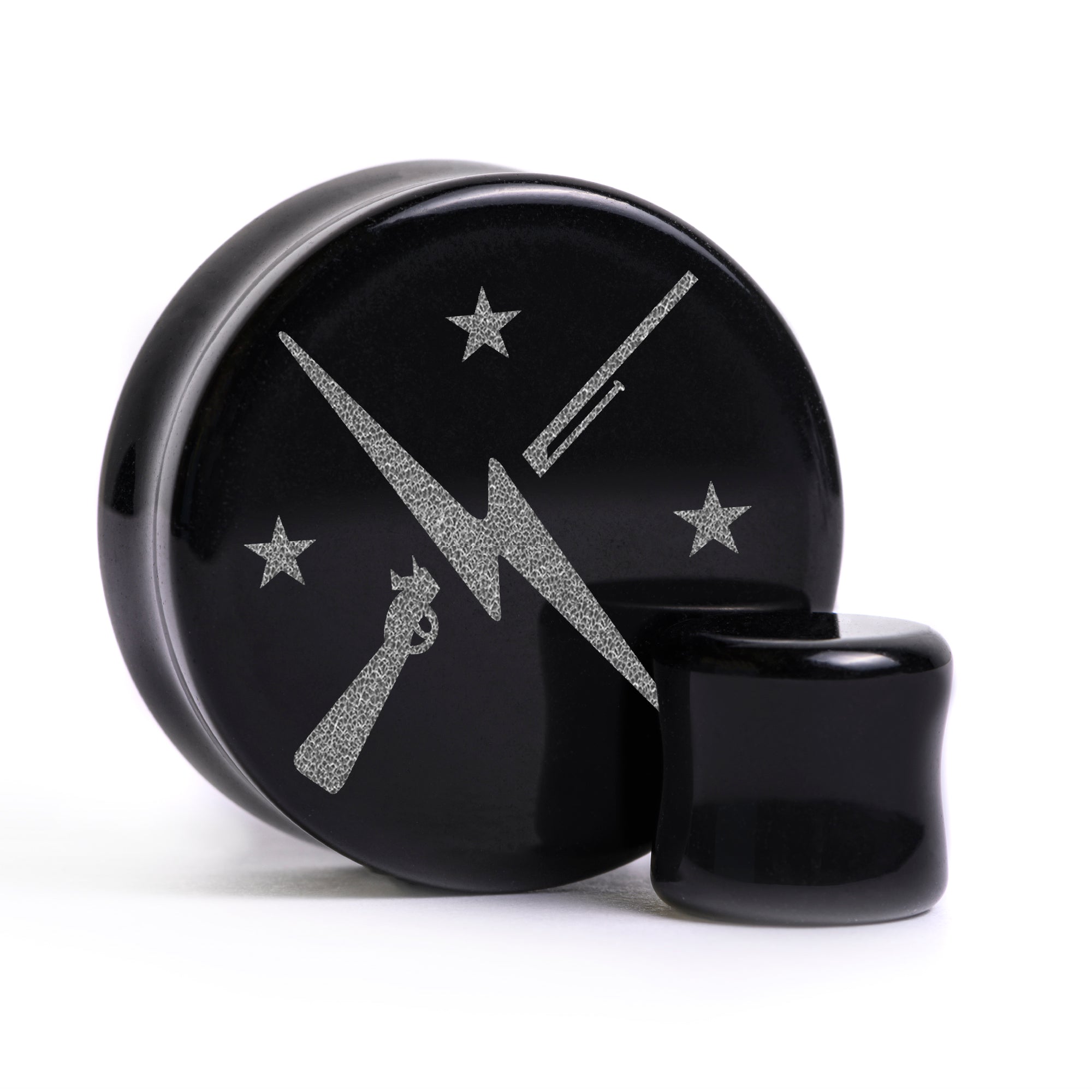 Flat Faced Doubleflared Black Glass Plugs featuring laser engraved "Minutemen Logo" design.