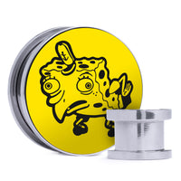 Limited Edition, High Quality Silver Steel Double flare Screw Back Yellow & Black Inlay Plugs featuring the laser engraved "Mocking Spongebob"