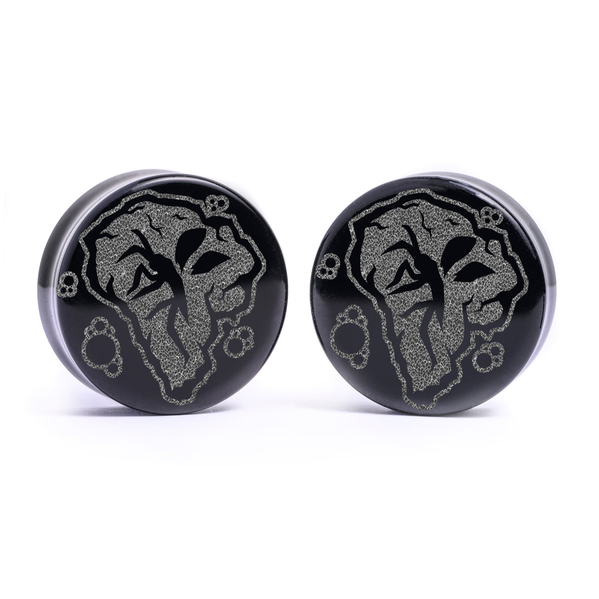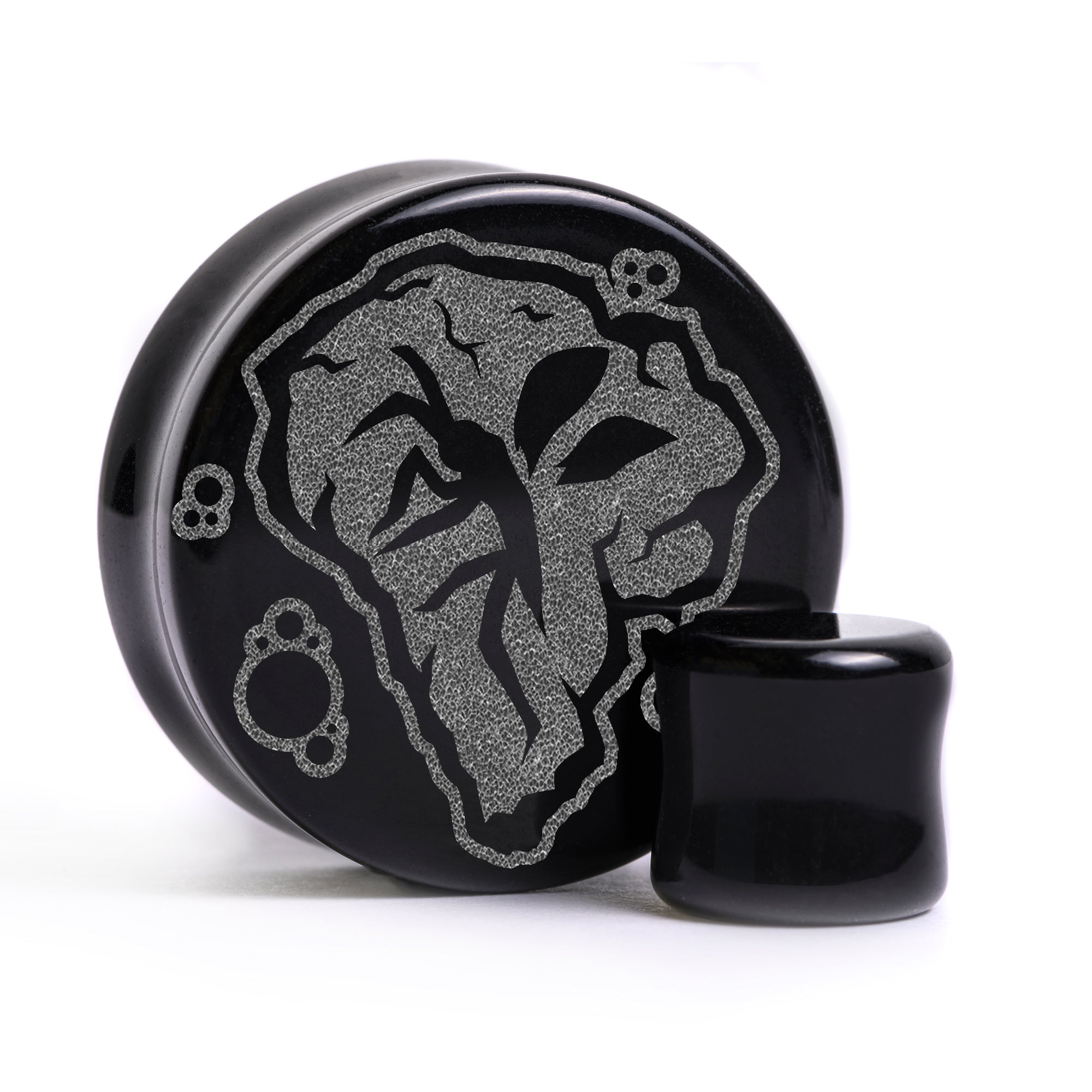 Flat Faced Doubleflared Black Glass Plugs featuring our laser engraved “Mosquito Island" design.