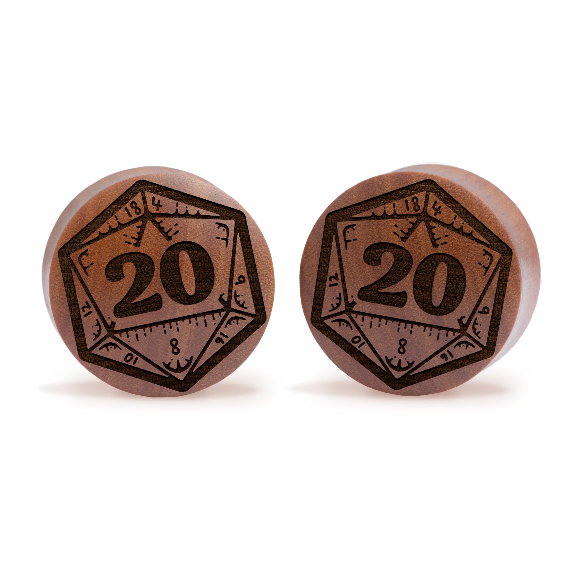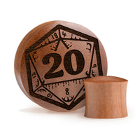 Convex Doubleflared Saba Wood Plugs featuring our laser engraved “Nat 20 Die D&D" design.