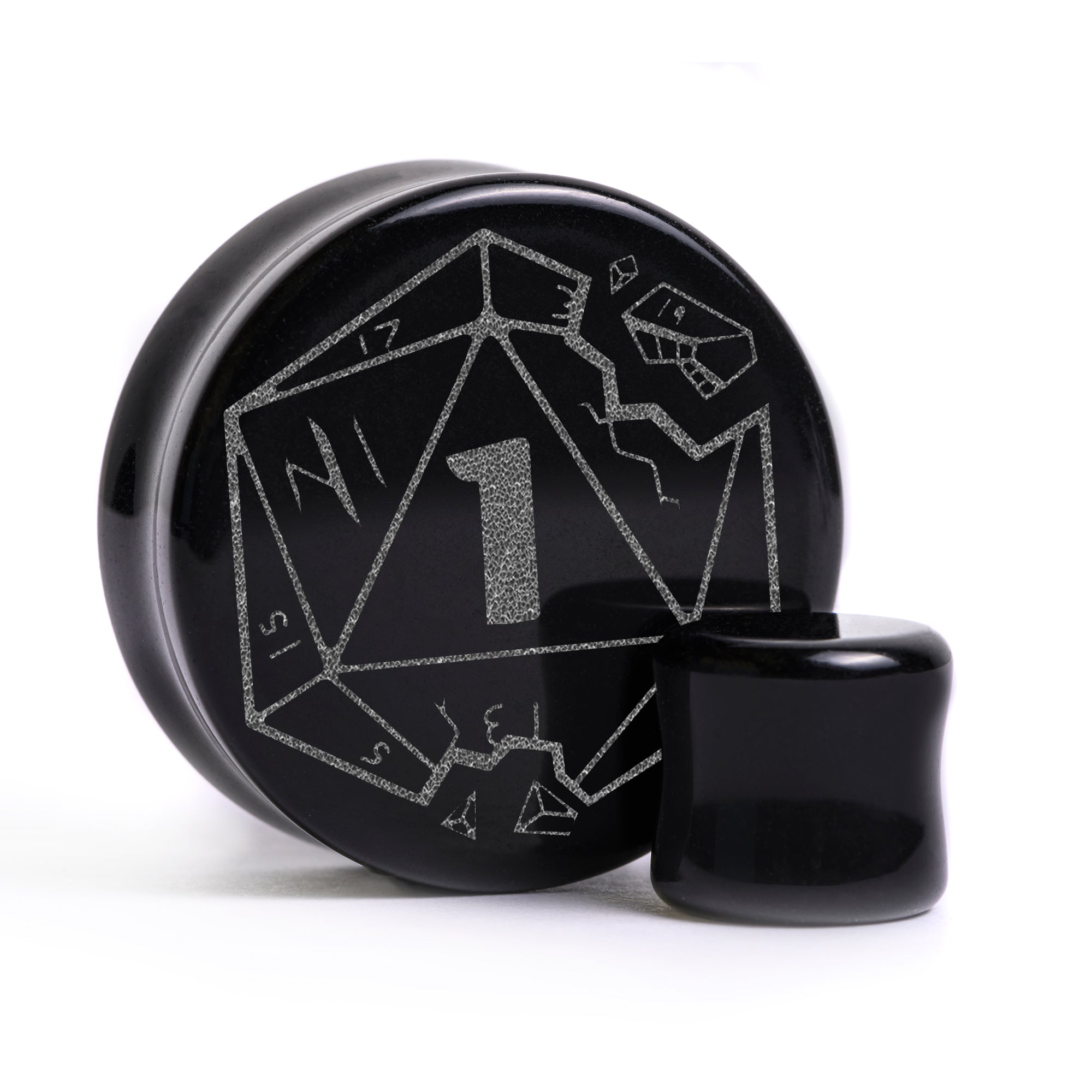 Flat Faced Doubleflared Black Glass Plugs featuring our laser engraved “Natural 1 Die D&D" design.