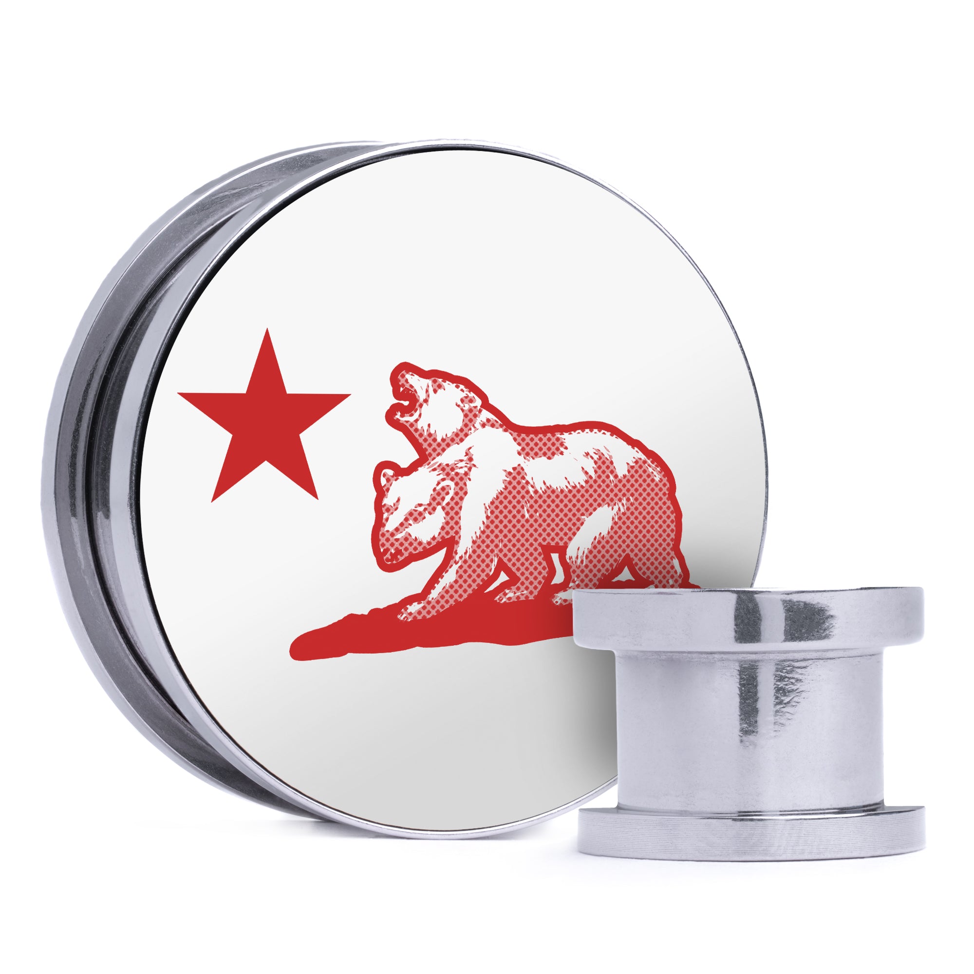 These plugs have a flat front and screw on back. Made from Surgical Steel with a White & Red Acrylic insert.