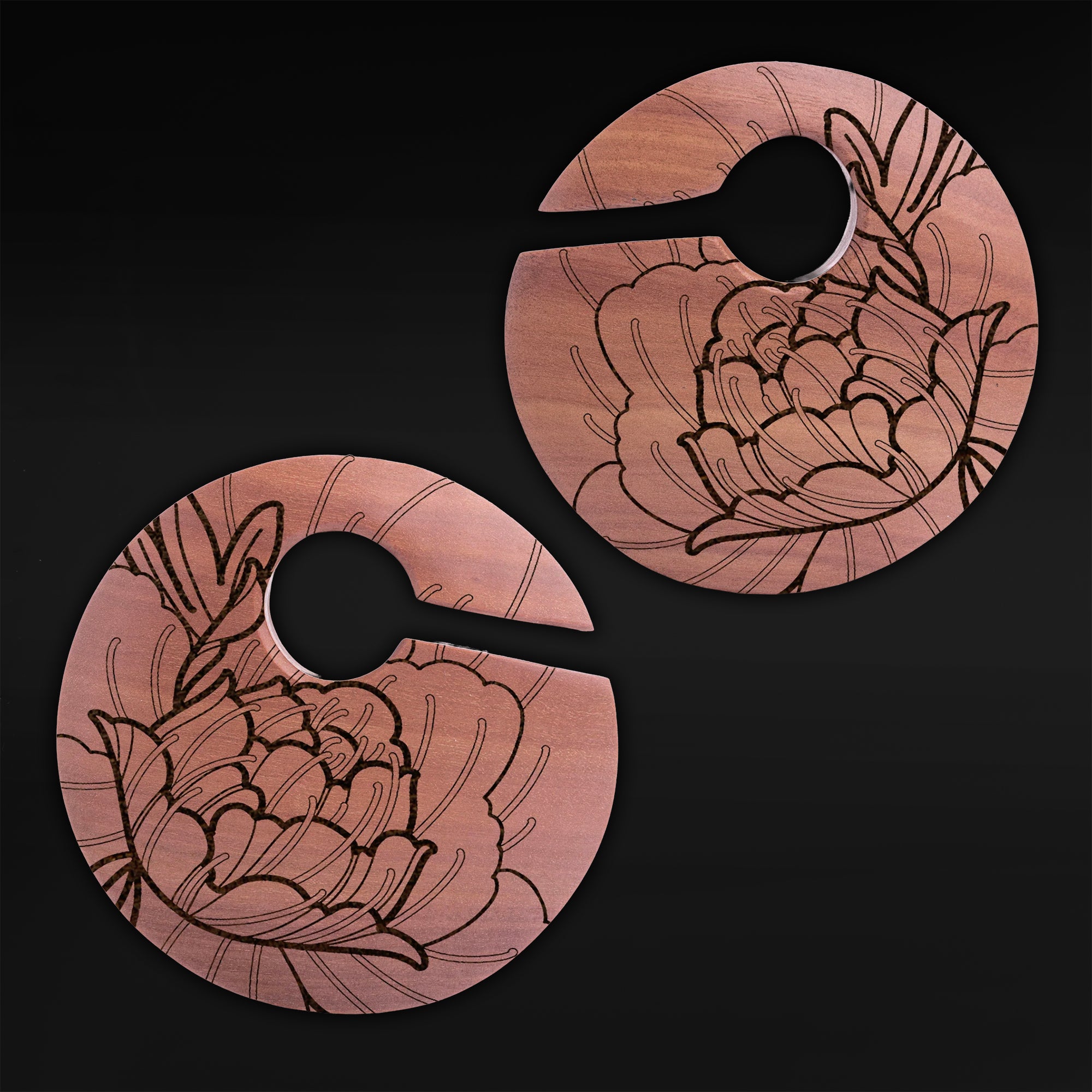 Saba circular wooden ear weights laser engraved with our Peony Design.