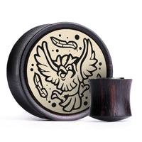 Limited Edition Double flared Ebony Ivory & Black Inlay Wood Plugs featuring the laser engraved Pokemon "Pidgey"
