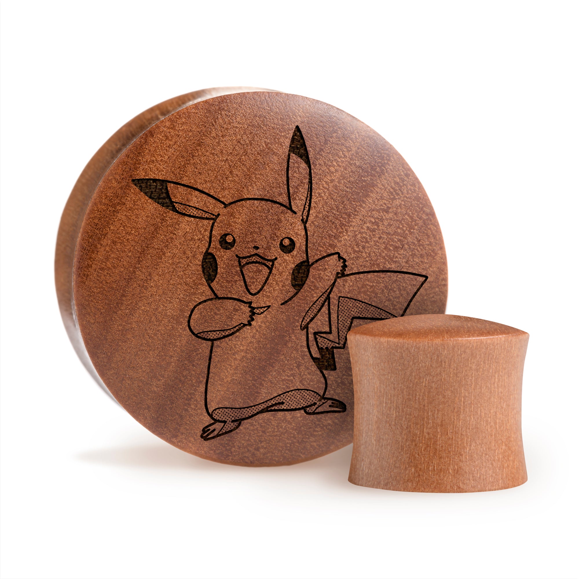 Convex Doubleflared Saba Wood Plugs featuring our laser engraved “Pikachu' design.