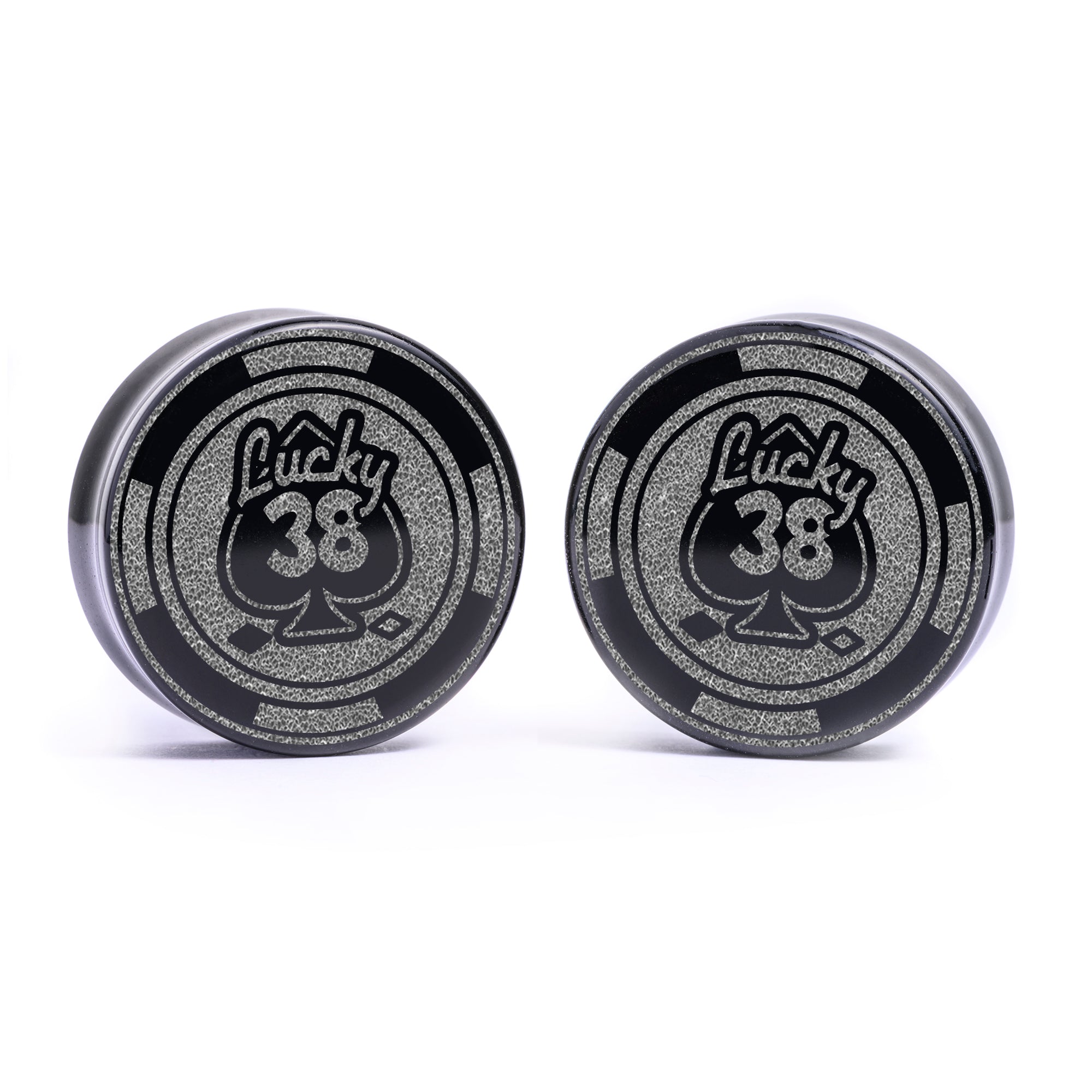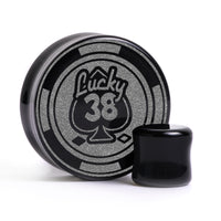 Flat Faced Doubleflared Black Glass Plugs featuring laser engraved "Platinum Chip" design.
