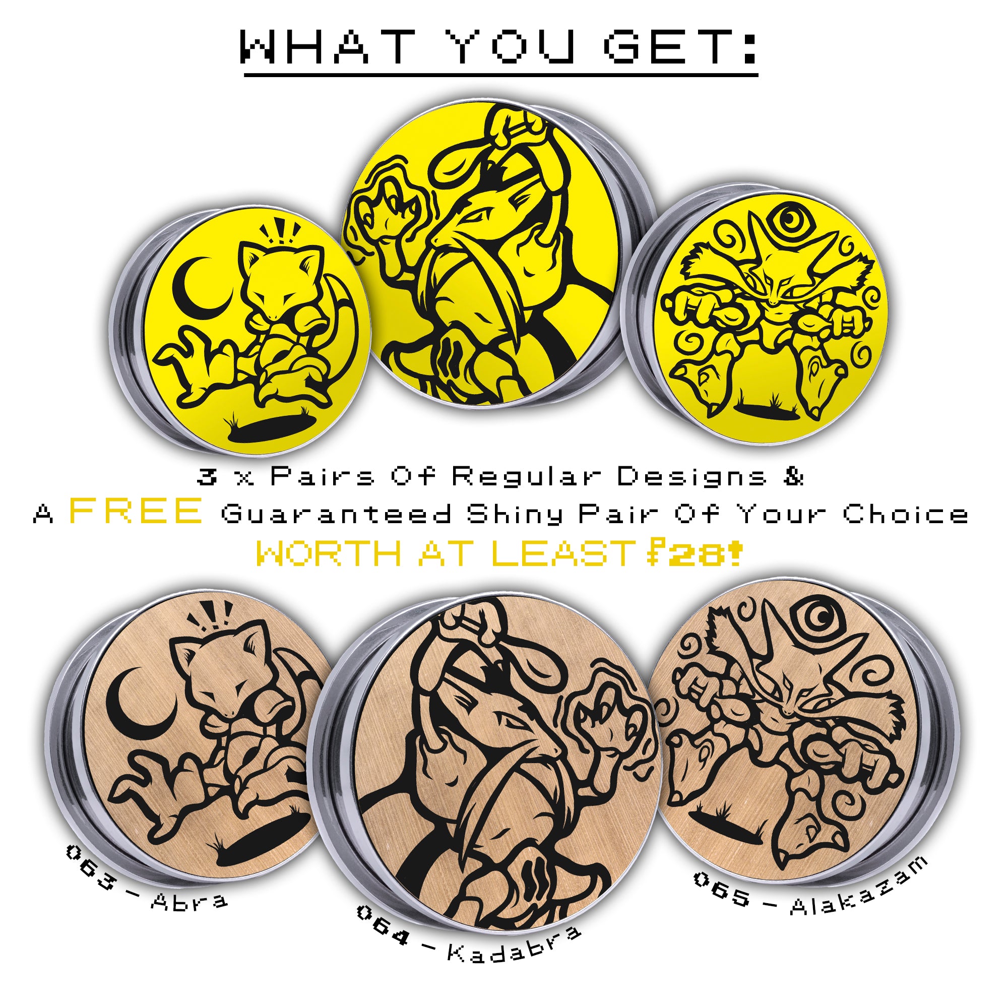 3 of the pairs are Yellow & Black inlay plugs featuring Abra, Kadabra & Alakazam as well as 1 FREE pair of SHINY INLAY PLUGS of your choice. Which Psychic Pokémon will you pick?