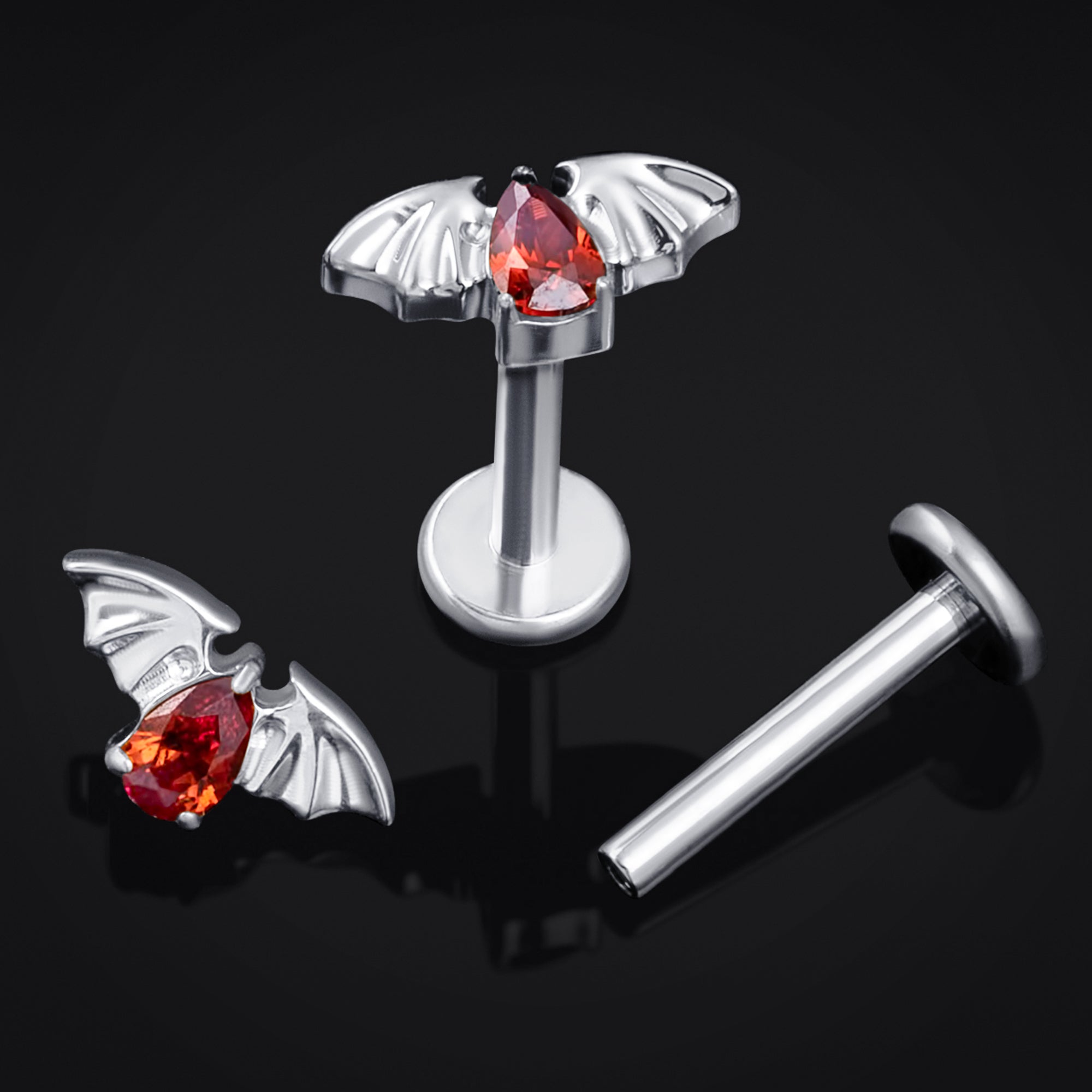 Red Jewelled Bat Silver Internally Threaded Titanium Labret Stud 1.2mm Gauge