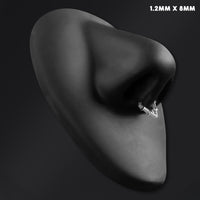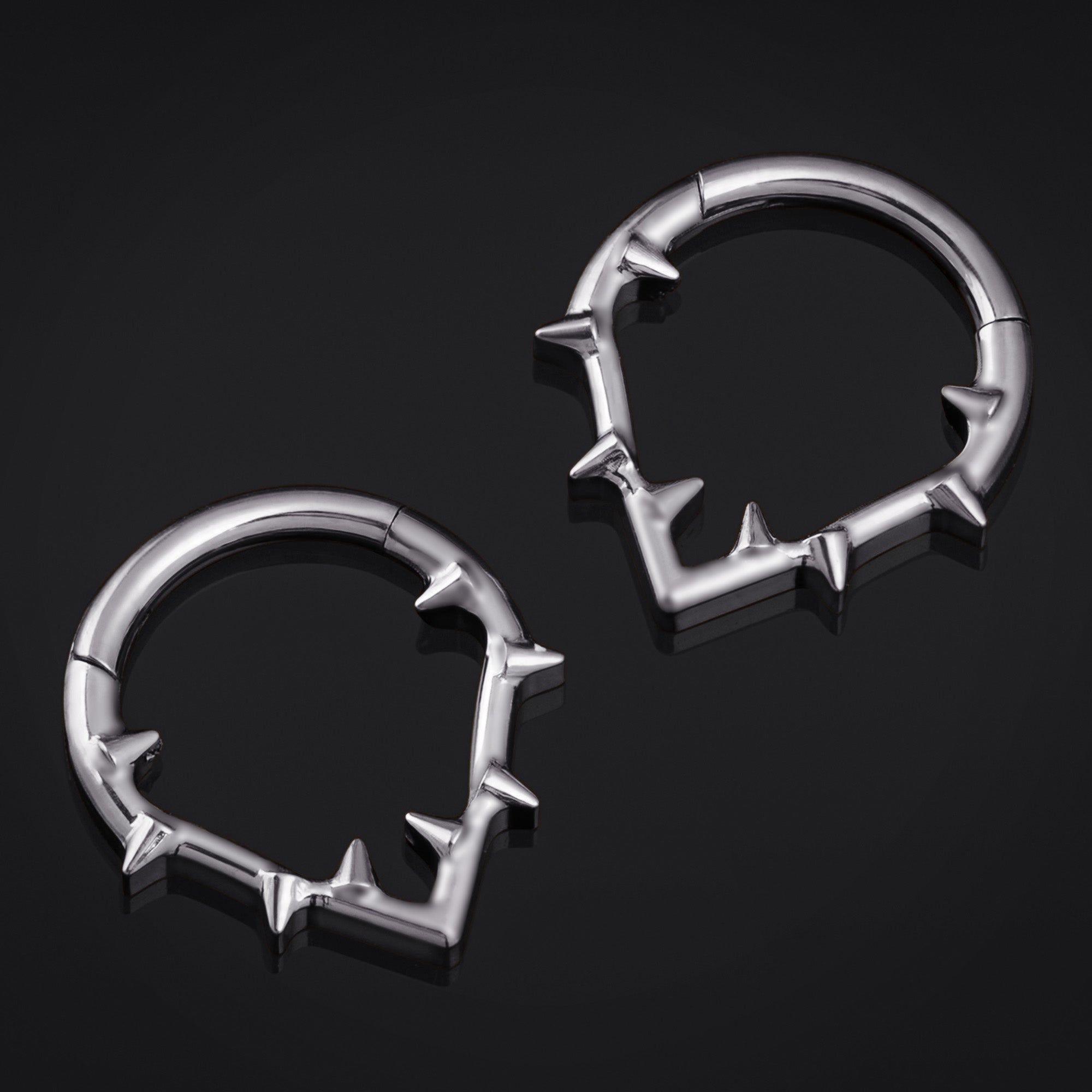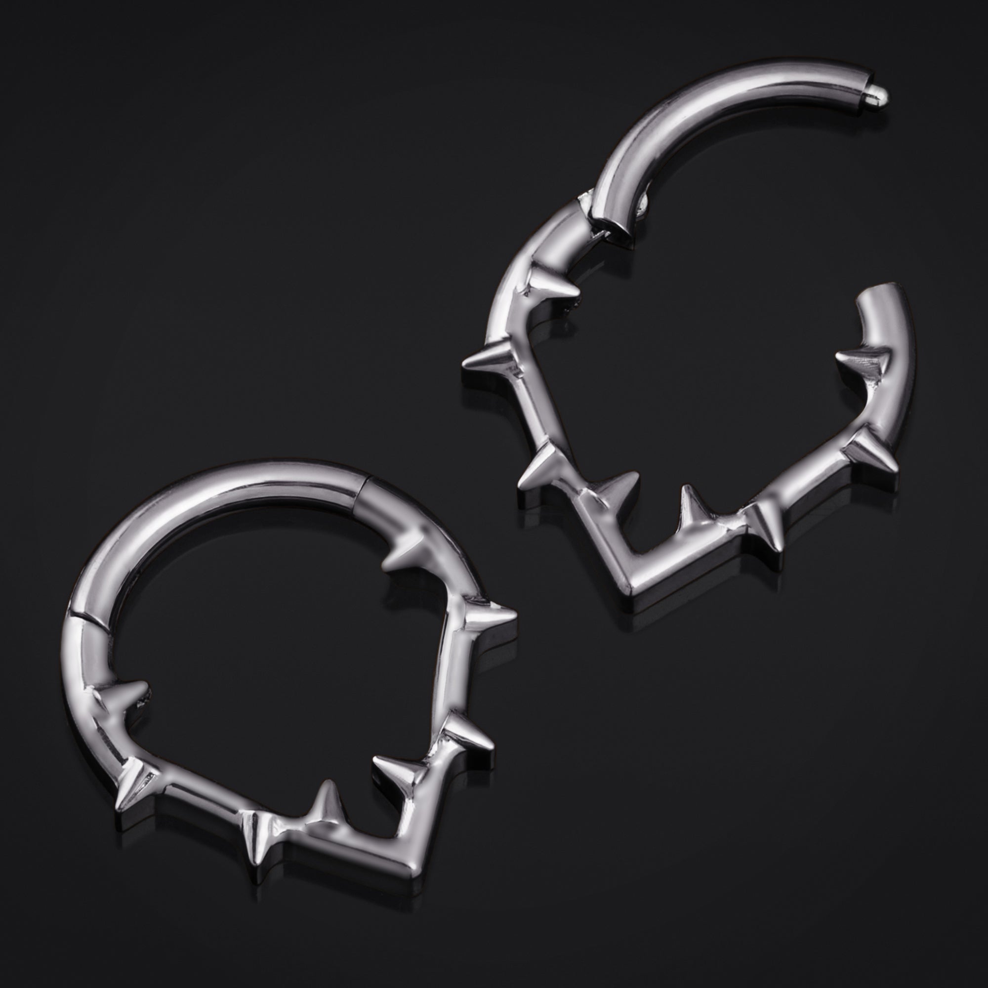 Make a bold statement with the Silver Thorns segment clicker septum ring, forged from durable ASTM F136 titanium. Its edgy thorn design wraps your septum in striking silver, combining fearless style with strength and comfort. Perfect for those who dare to stand out and redefine piercing fashion.