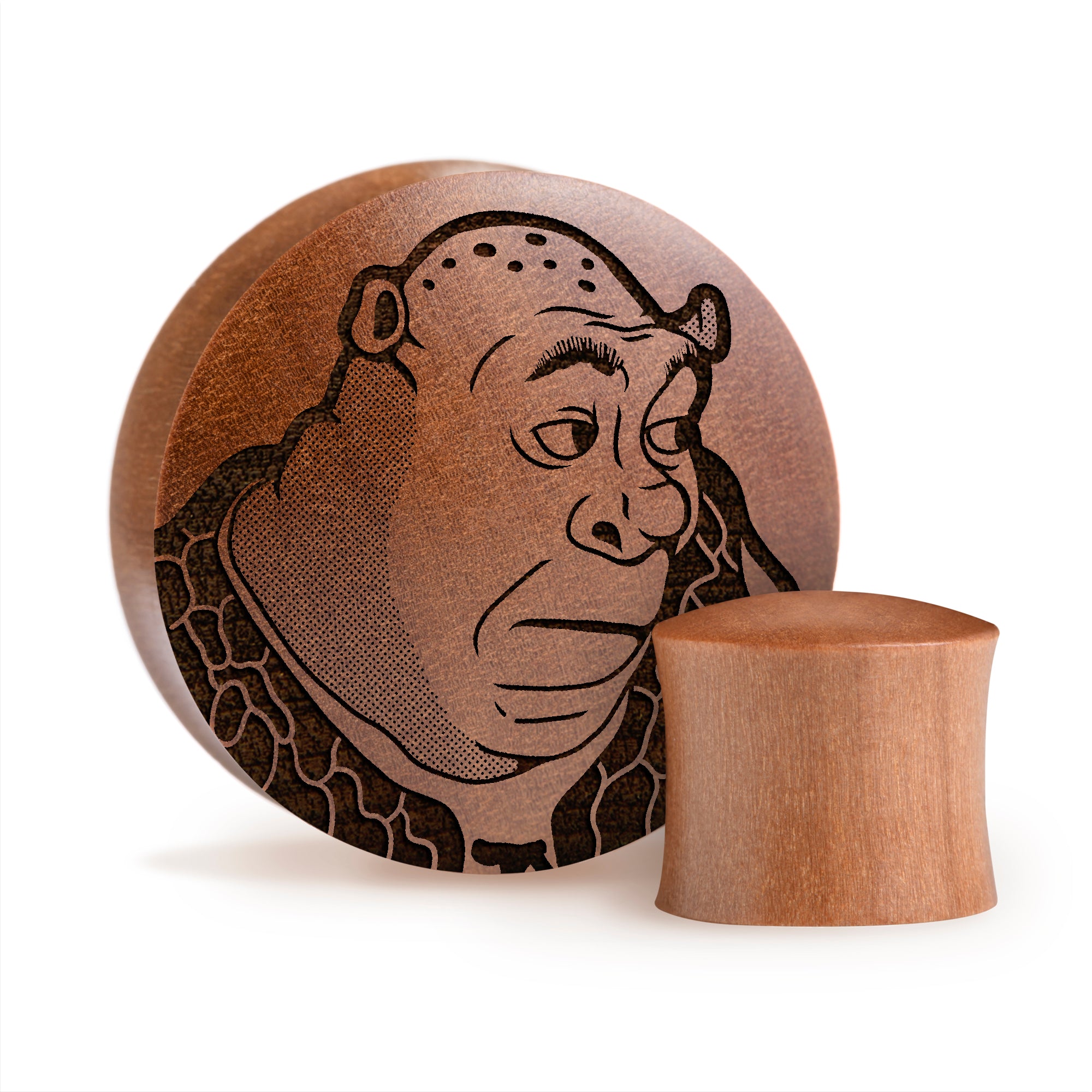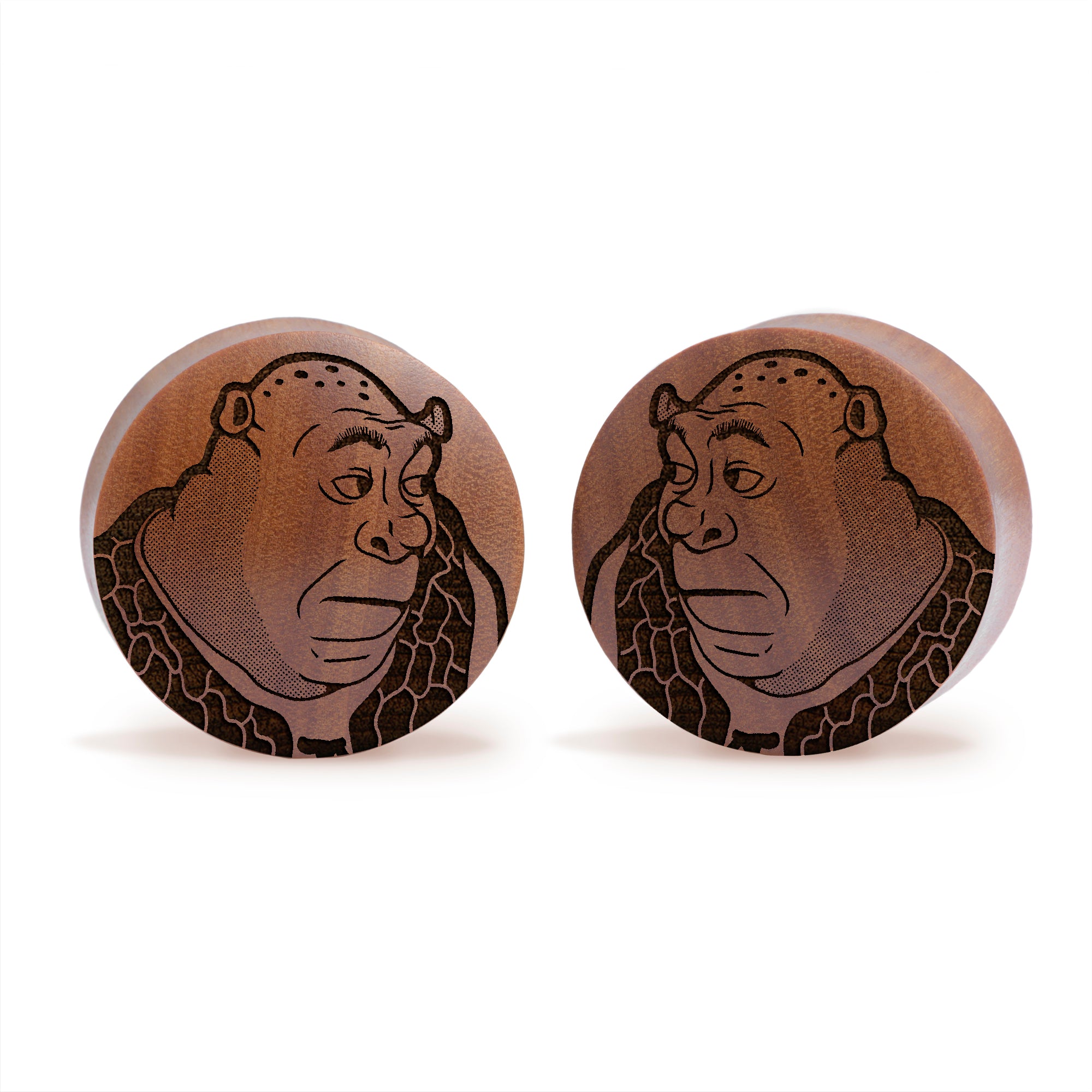 Convex Doubleflared Saba Wood Plugs featuring our laser engraved “Shrek" design.