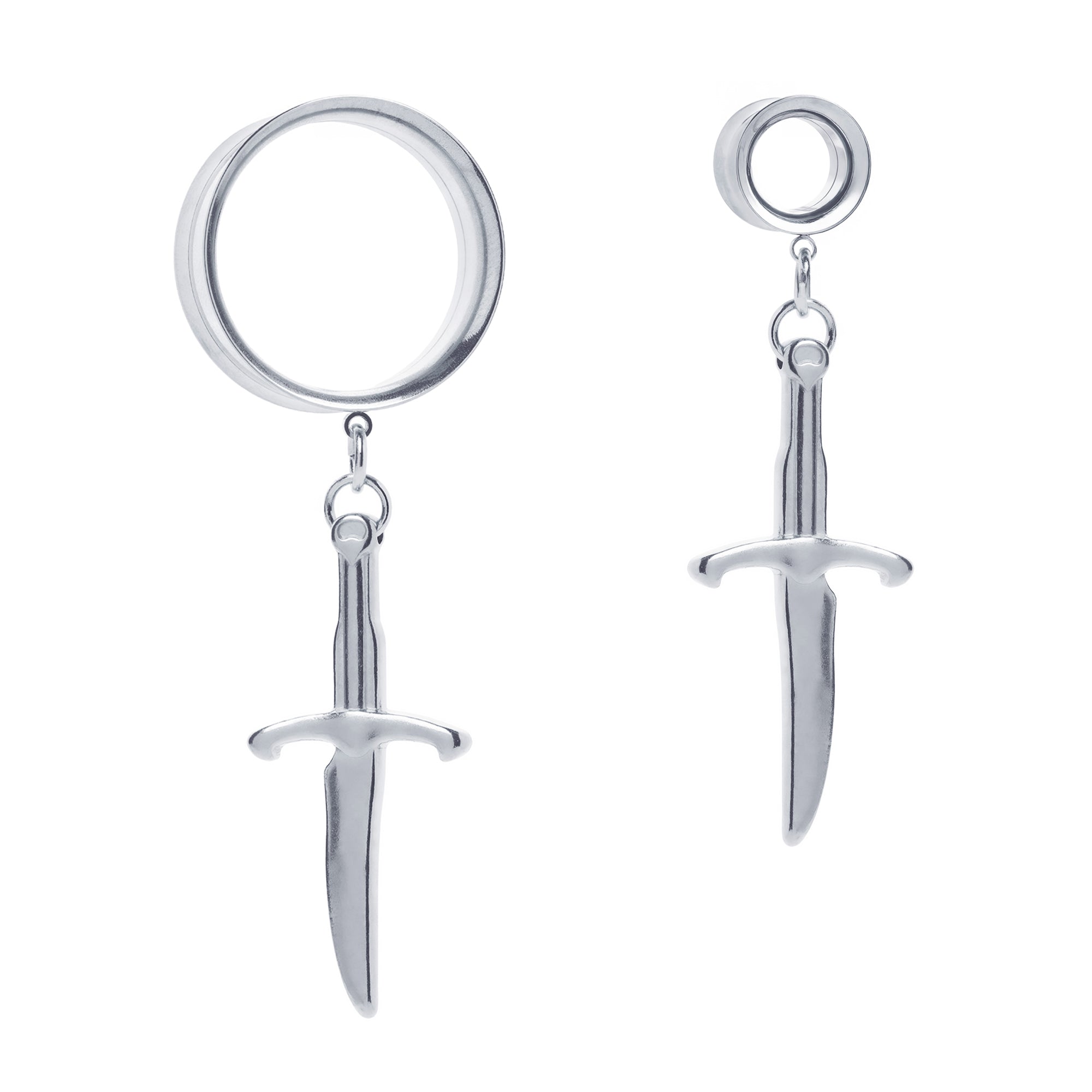 High Quality Silver Dagger Double Flared Tunnel Dangle. Double flare steel Tunnel with Screwback.