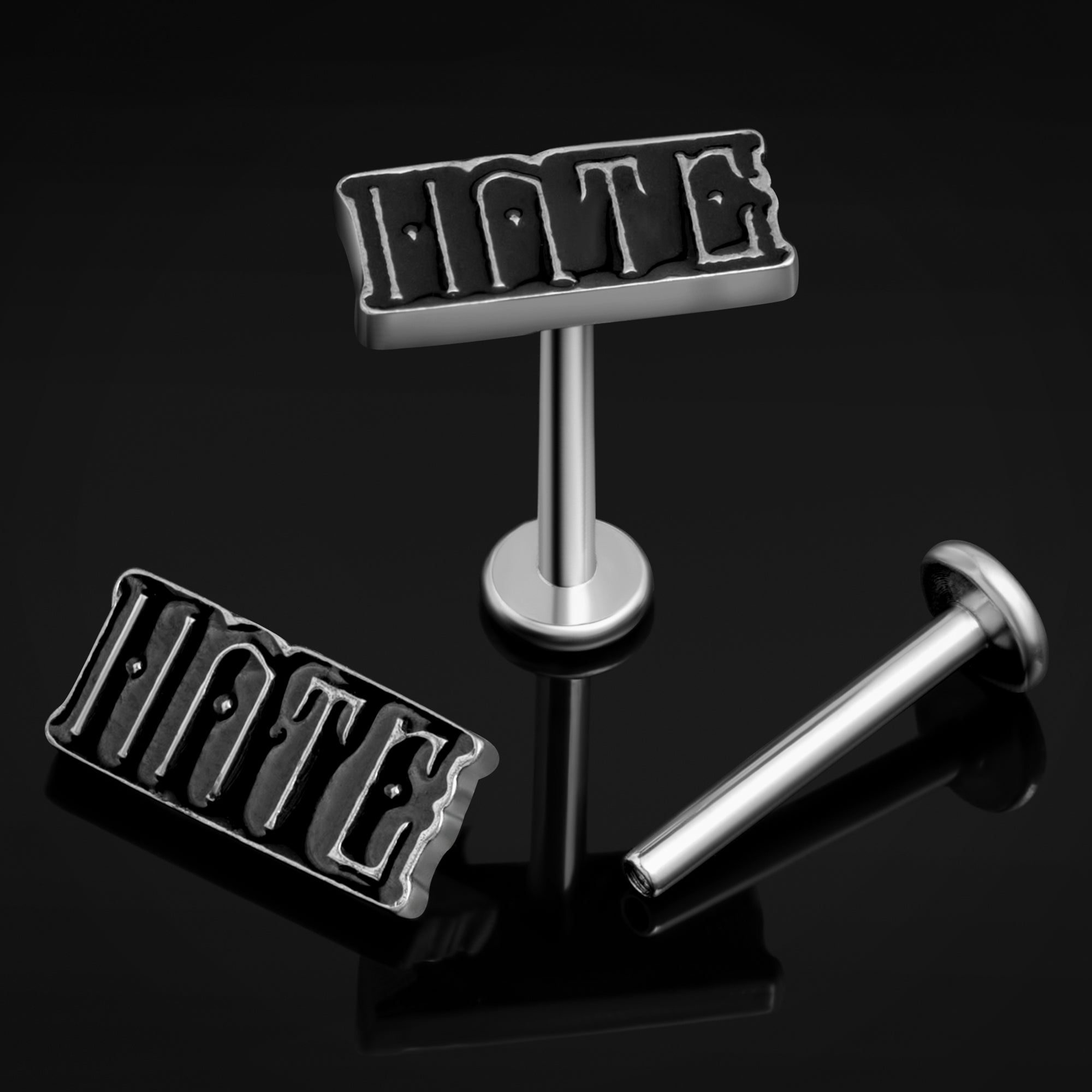 Silver Hate ASTM-F136 Titanium Internally Threaded Labret Stud 1.2mm Gauge. Silver 'Hate' Text Design with Black Enamel