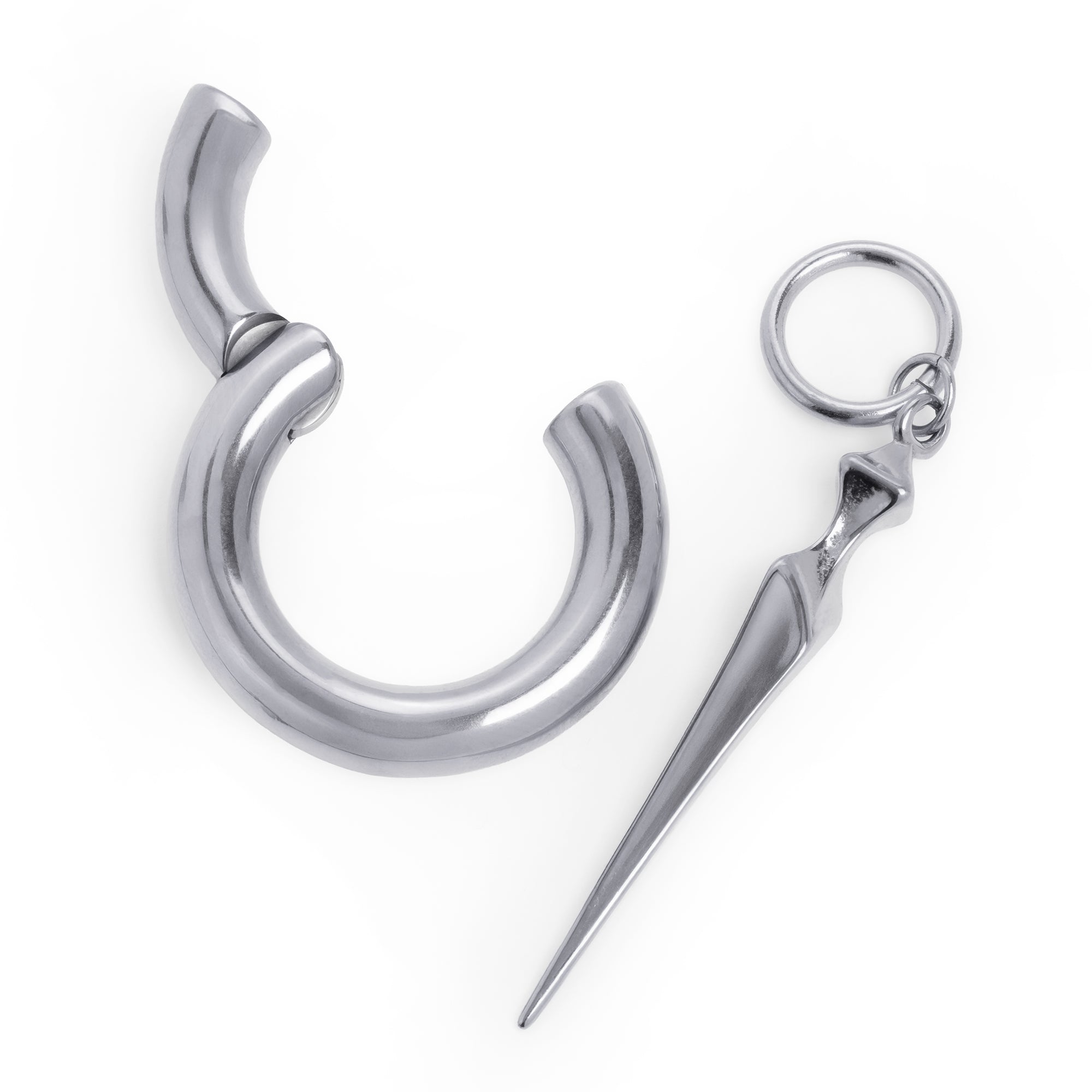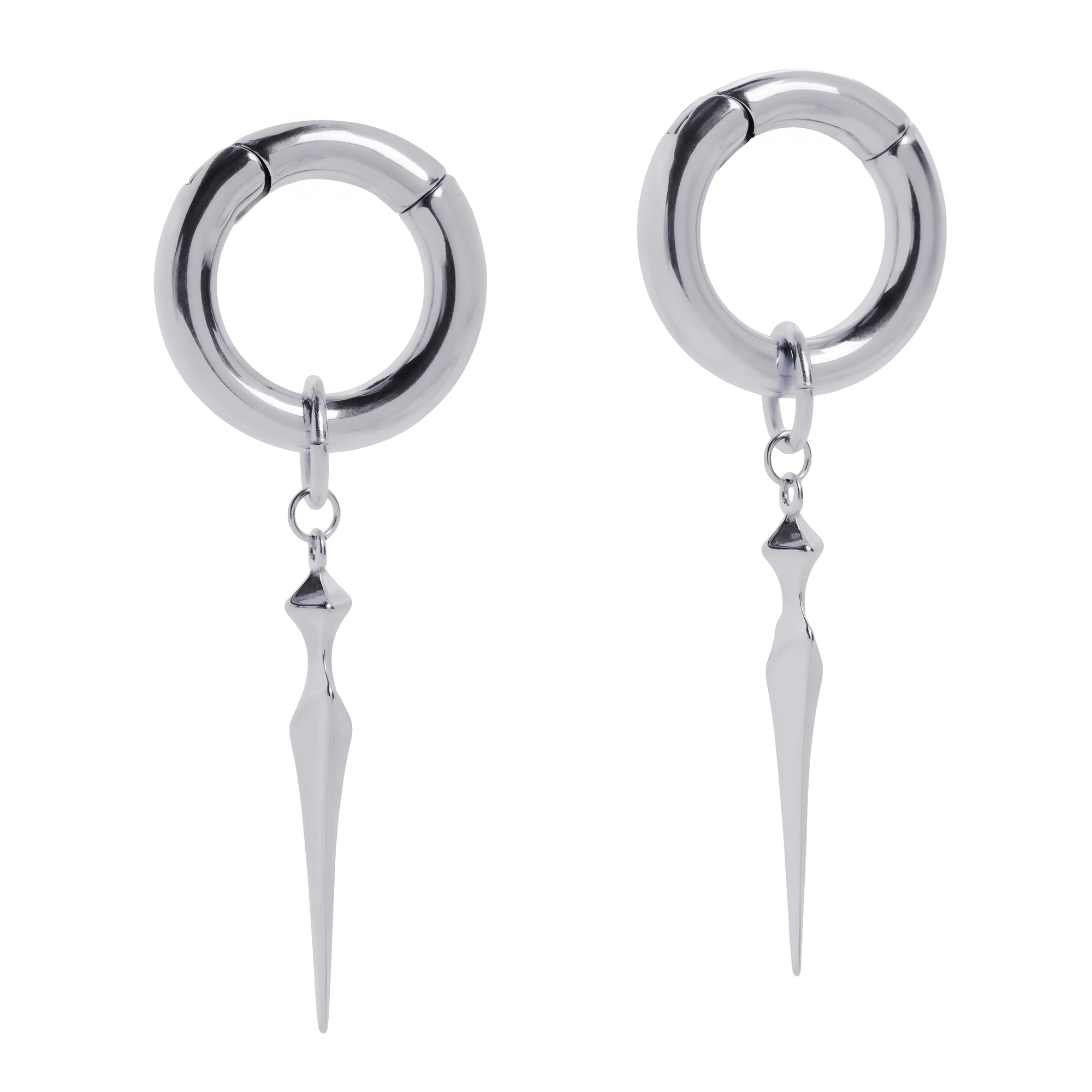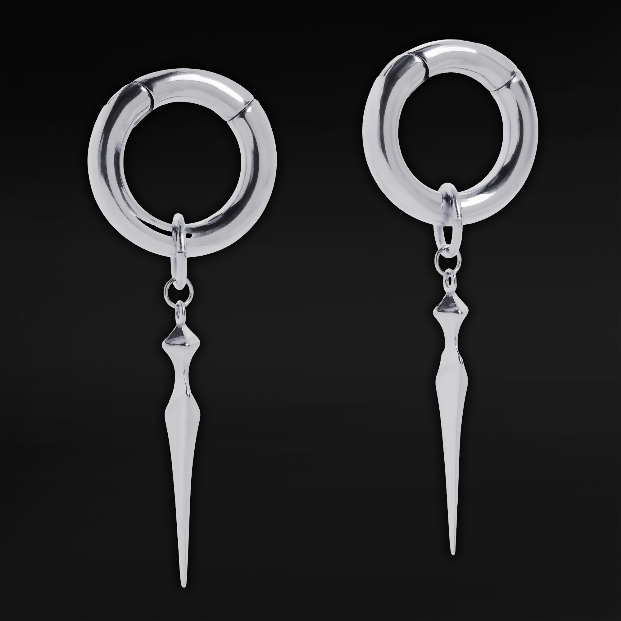 Made from 316l stainless steel. A minimum stretched ear of 6mm is needed to wear this product. Please note they weigh approx 18 grams each and their internal diameter is 18mm. The Obelisk Point Dangle is 40mm in Length.