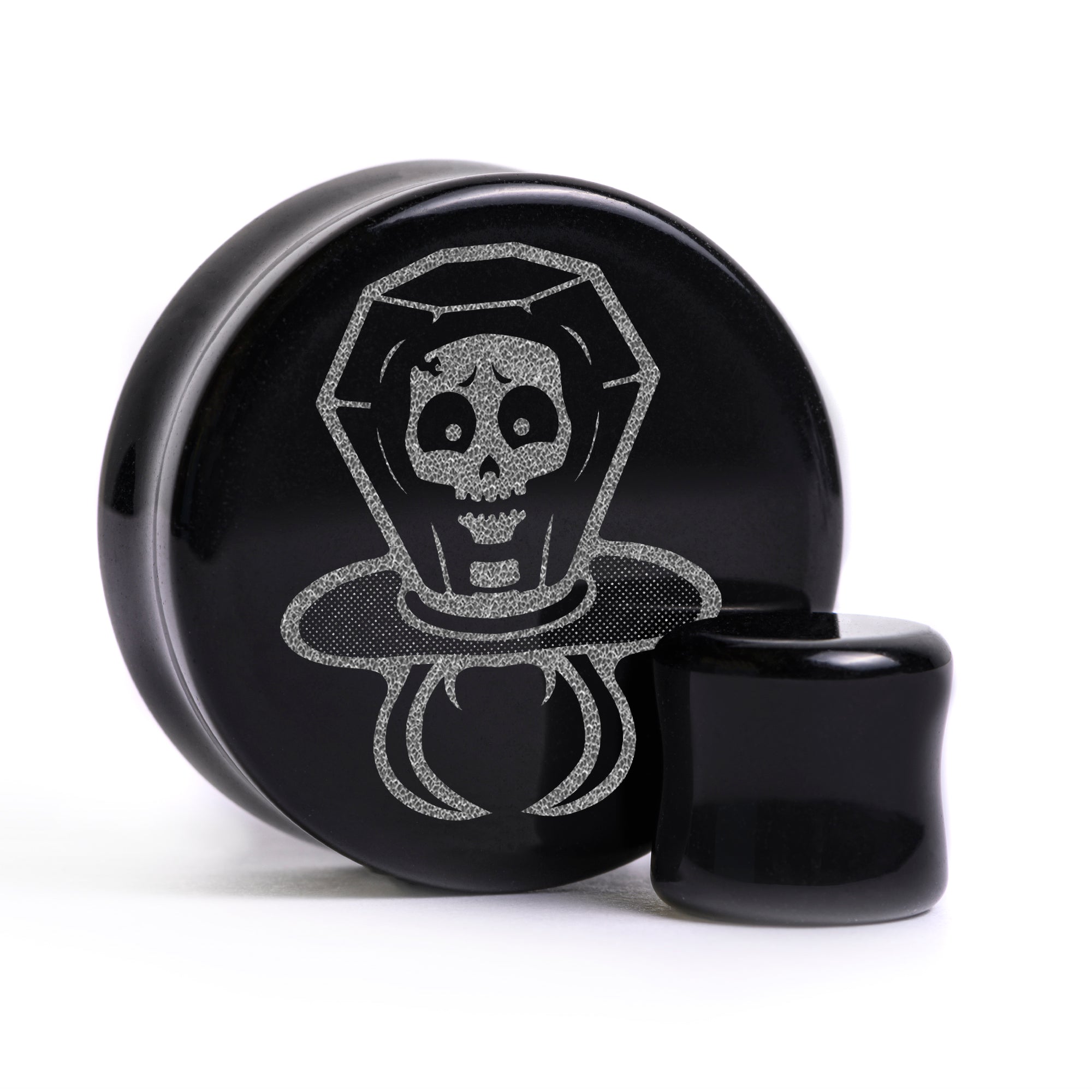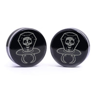 Limited Edition Flat Faced Doubleflared Black Glass Plugs featuring our laser engraved “Skull Candy Ring" design. This product is part of our Halloween Promotion