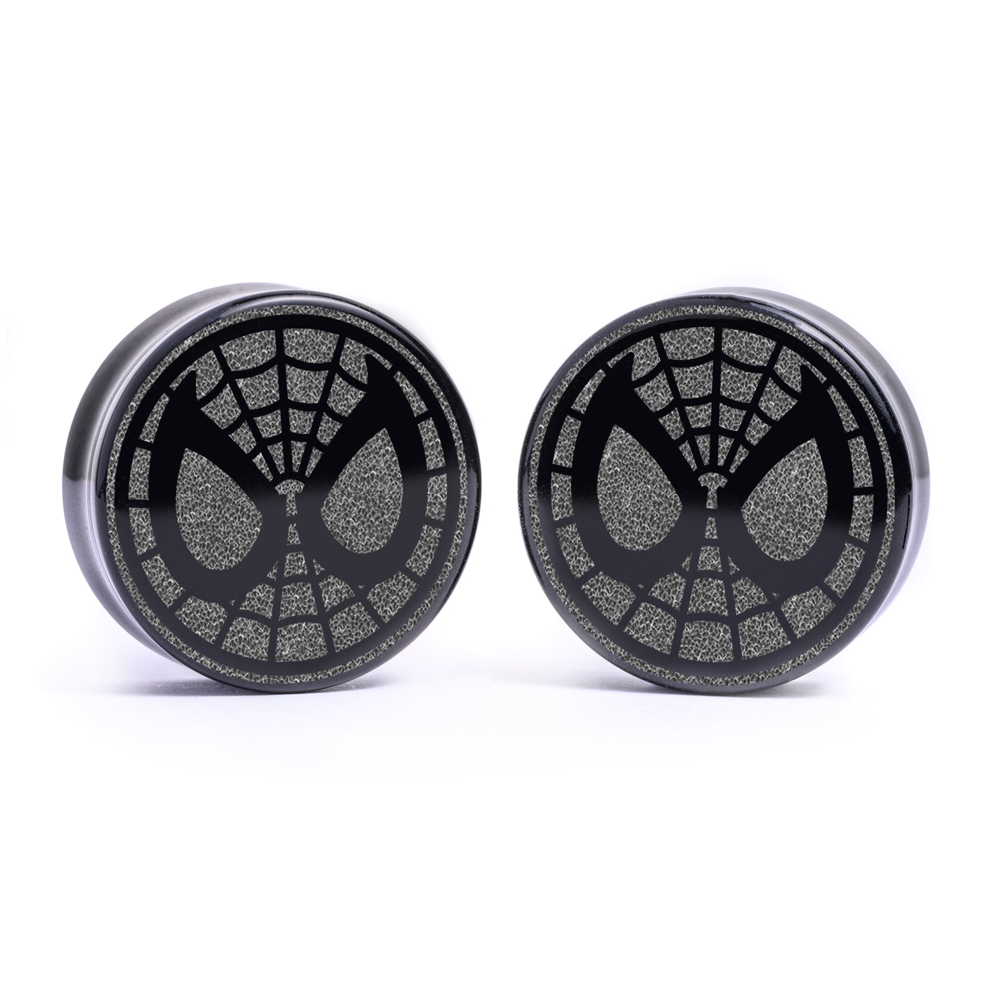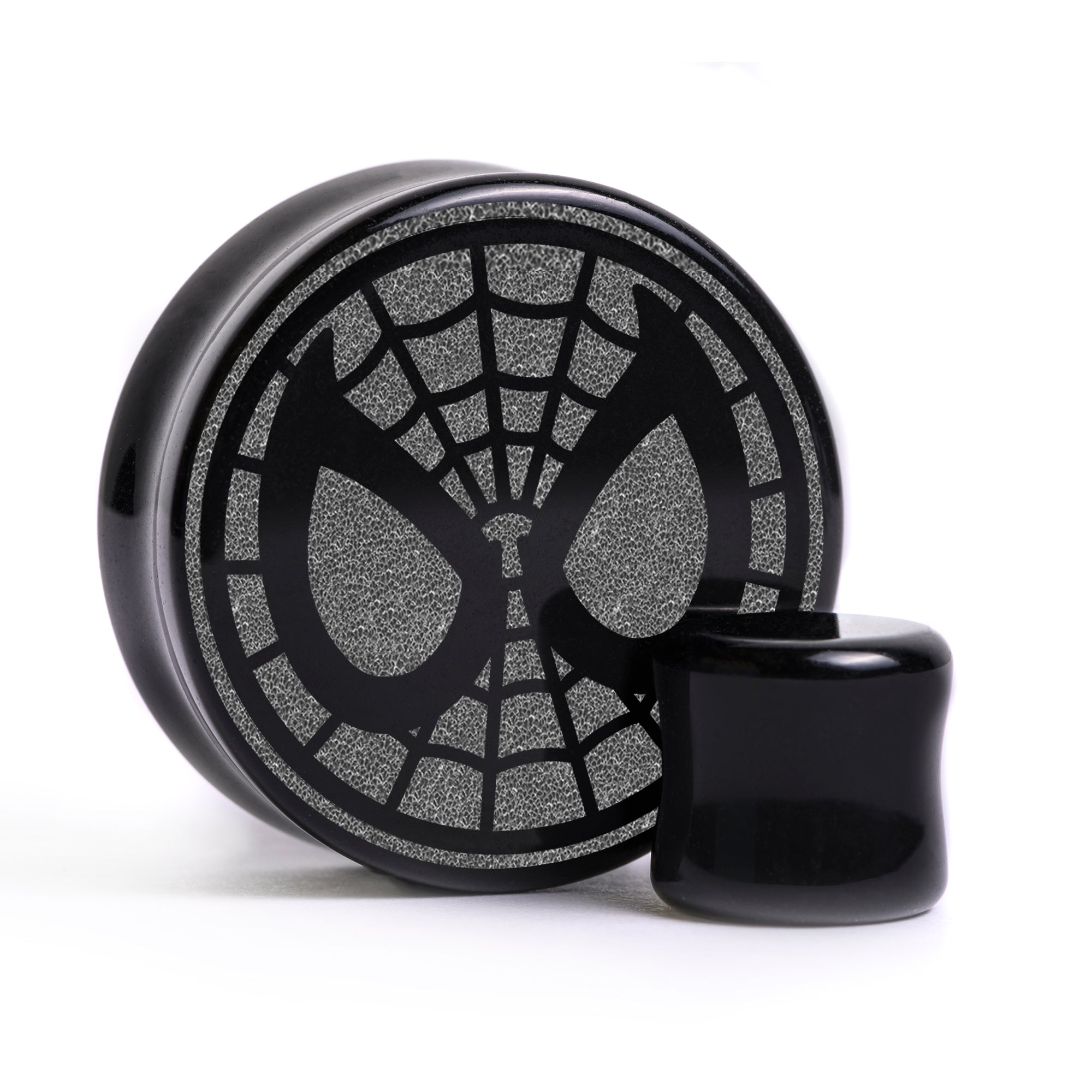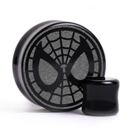 Flat Faced Doubleflared Black Glass Plugs featuring our laser engraved “SPIDERMAN" design.