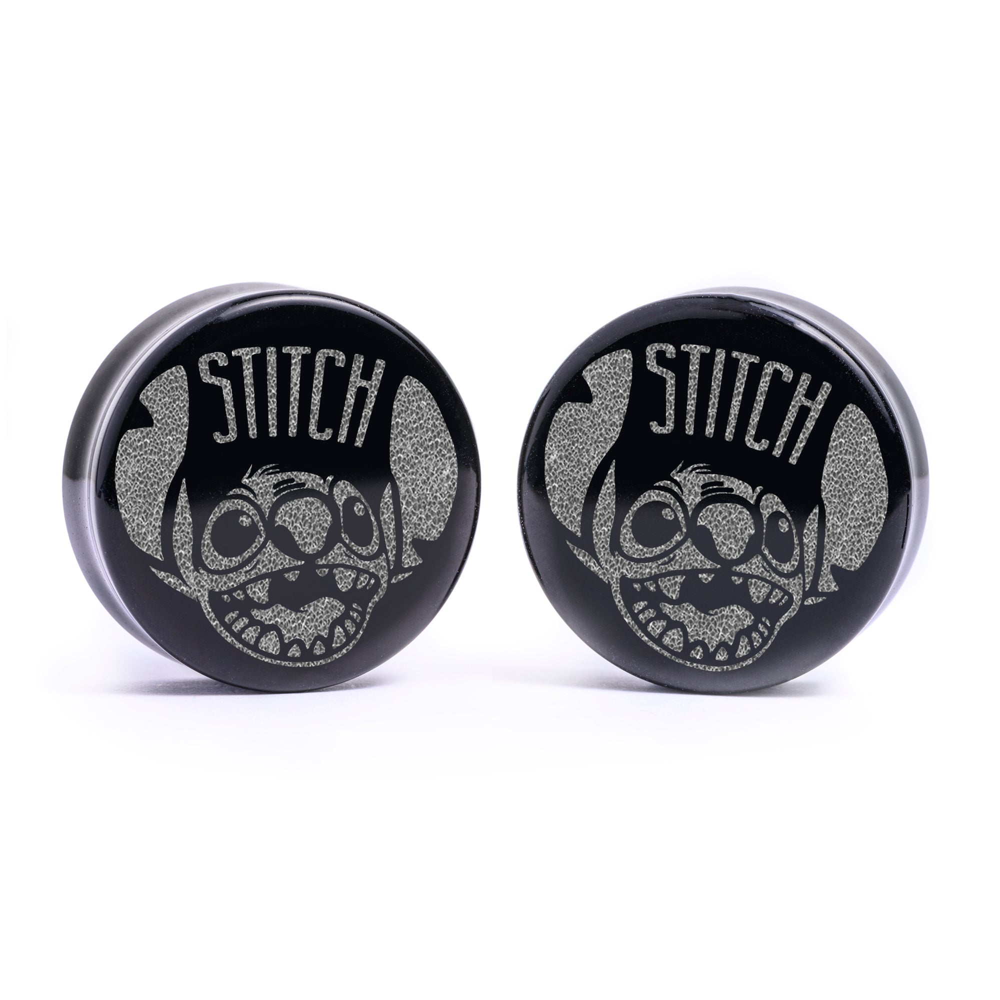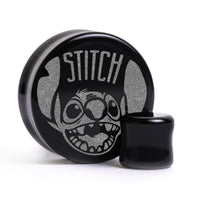 Flat Faced Doubleflared Black Glass Plugs featuring laser engraved “Stitch"  plugs have a flat front and flat back.‚ Glass plugs are known for being smooth, durable and easy to insert.‚ Glass is an inert material which makes them great for people with sensitive ears as they are very unlikely to cause reactions.